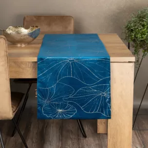 Bieżnik BLINK 18 wykonany z miękkiej i miłej w dotyku tkaniny welwetowej z nadrukiem delikatnych liści lilii wodnej, które pokrywają jego powierzchnię lśniącym, punktowym nadrukiem w złocistym odcieniu. Nowoczesny  nadruk naniesiony został na tkaninę metodą pikselową, dzięki niemu, widoczne są pojedyncze drobinki tworzące botaniczny wzór liści. Taka dekoracja wyróżni Twój stół, sprawdzając się zarówno w klasycznie urządzonym wnętrzu, jak i w aranżacji w stylu glamour.  Nasze kolekcje powstają z pasji i miłości do pięknych wnętrz - uczyń swoje wnętrze piękną przystanią, w której miło jest spędzać wolny czas!
