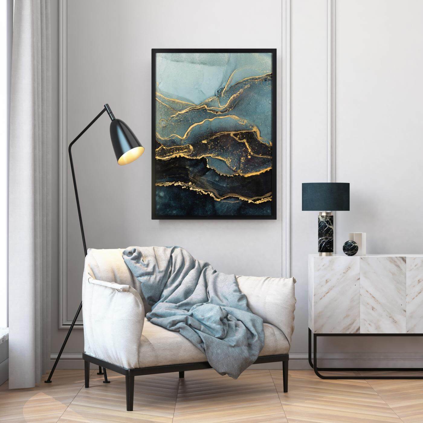 Innym przykładem niech będzie salon w kolorach czerni. Czarna ściana zdobiona sztukaterią, ciemne fotele i dywan na podłodze. Czy salon wygląda ponuro i zimno? Wcale nie, to dzięki lampie, która tworzy we wnętrzu ciepły i fascynujący efekt wizualny. Klosz lampy zaprojektowano z luźno zwisających prostokątnych, szklanych elementów, przymocowanych do złotej oprawy. Tak niewiele potrzeba, jedna jedyna lampa, to właśnie jest cichy luksus! Jakość ponad ilość.
