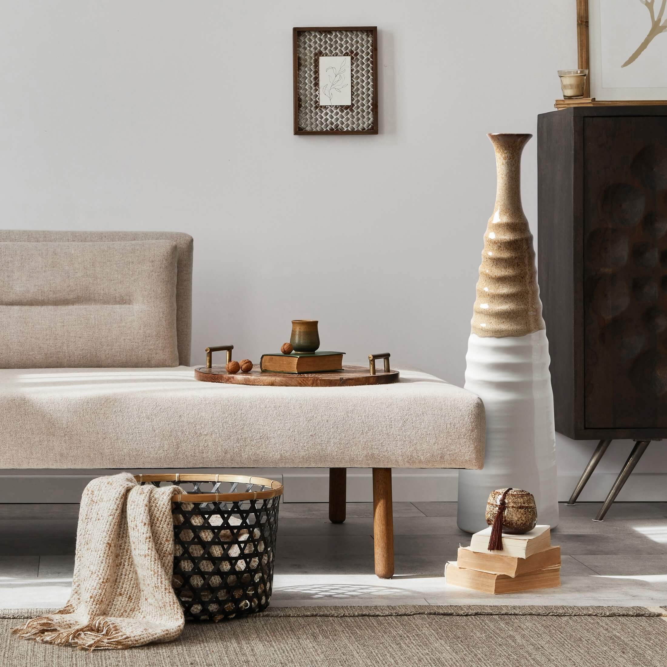 Mówiąc o trendach aranżacyjnych nie sposób wspomnieć o kolorach. Wybór kolorów ma kluczowe znaczenie w modnych wnętrzach. W 2024 roku dominują ciepłe odcienie i naturalne barwy. W połączeniu z dodatkami wykonanymi z naturalnych materiałów, dają poczucie relaksu, spokoju, wyciszenia, tworzą harmonijną przestrzeń. Takie naturalne kolory pełnia rolę idealnego tła dla bardziej wyrazistych akcentów kolorystycznych. Kanapa w kolorze karmelowym, w otoczeniu białych ścian i delikatnych, zwiewnych białych zasłon, prezentuje się wyjątkowo. To inspiracja do stworzenia przytulnego salonu w ciepłych kolorach.
