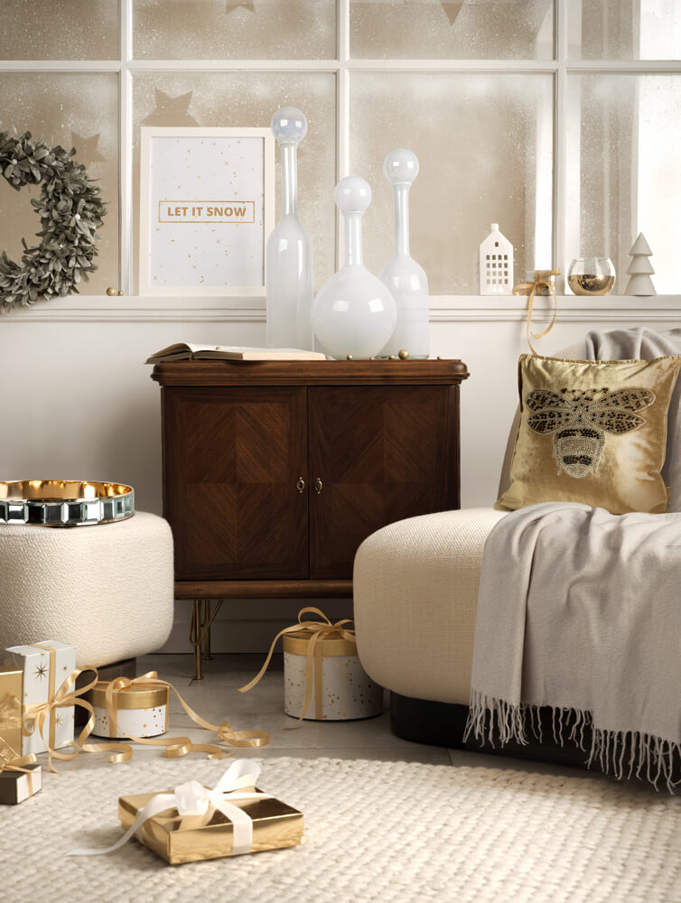 W salonie na komodzie zawsze elegancko będzie wyglądała ceramika. Piękne ceramiczne misy na owoce, słodycze, a może biżuterię. Do tego klimatyczna lampa z welwetowym abażurem i oczywiście wazony, a w nich piękne żywe kwiaty. Szukaj przedmiotów o ciekawych kształtach i kolorach, pozwól sobie na odrobinę szaleństwa. Bardzo popularne i nowoczesne są również różnego rodzaju figurki dekoracyjne. Mogą przedstawiać ptaki lub inne zwierzęta, owoce, kule czy liście. Figurki w kolorach złota czy srebra odbijają światło, pięknie się mienią, co optycznie powiększa przestrzeń. To częsty wybór w salonach w stylu nowoczesnym czy glamour. Dekoracja komody potrafi dodać wnętrzu klimatu. Szczególnie w okresie świątecznym, wykorzystujemy nasze komody aby podkreślić klimat świąt.