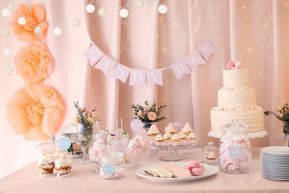 Oprócz ozdób na stole ważne jest także jego otoczenie, zatem warto zadbać też o inne dekoracje. Jest to szczególnie ważne, jeśli stół na przyjęciu ma pełnić funkcję ustawionego gdzieś z boku bufeciku, do którego można podejść i poczęstować się przygotowanymi przekąskami. Jeśli chcesz urządzić taki „słodki kącik”, możesz rozwiesić za nim kolorowe baloniki i chorągiewki. Ładnie prezentował się będzie także na tle pastelowej, gładkiej tkaniny zasłonowej – możesz tą samą tkaniną nakryć także stół. Uroku doda aranżacji także rozwieszenie kolorowych lampek (cotton balls) i ustawienie na stole wazonów z małymi bukiecikami kwiatów. Możesz także przygotować samodzielnie piękny napis np. z imieniem swojego dziecka lub życzeniami „sto lat”.