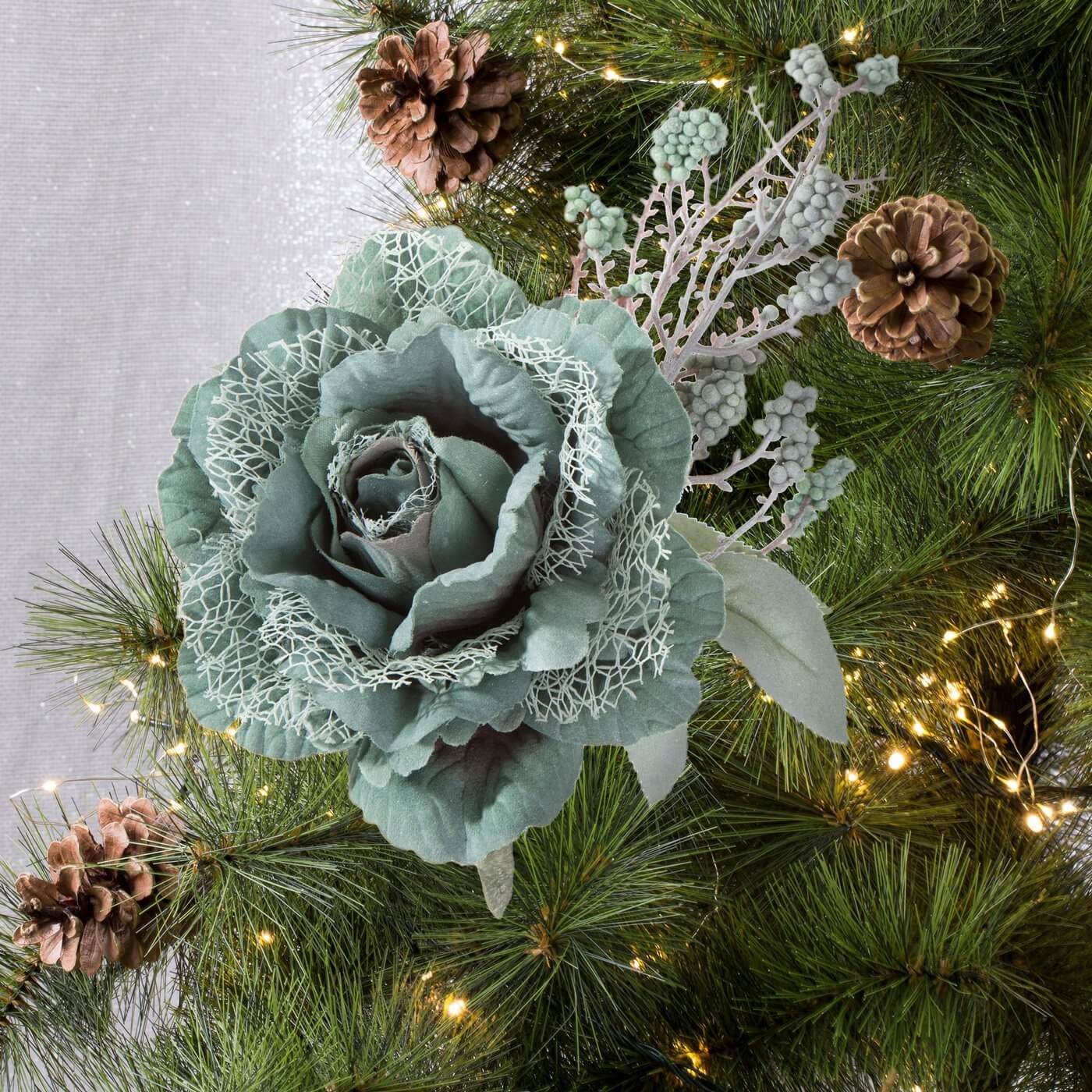 Świąteczna aranżacja jadalni nie byłaby kompletna, gdyby zabrakło w niej zjawiskowo pięknie ubranego drzewka. W choinowym wystroju postawiliśmy na elegancką biel w formie zachwycająco pięknych, okazałych sztucznych kwiatów, dopełnionych atrakcyjnymi ozdobami. Bezsprzecznie zjawiskowy efekt końcowy zapewniło połączenie bieli z delikatną zielenią choinkowych bombek. Całość prezentuje się niezwykle urokliwie i stylowo. W rezultacie, aby podkreślić świąteczny klimat na stole, nie mogło zabraknąć także wytwornych świeczników, wyróżniających się fantazyjną formą i odrobiną subtelnego błysku glamour. Istotnie dodanie do nich świec, dopasowanych barwą do całej stylizacji dało naprawdę spójny efekt szyku i elegancji w świątecznym wydaniu.