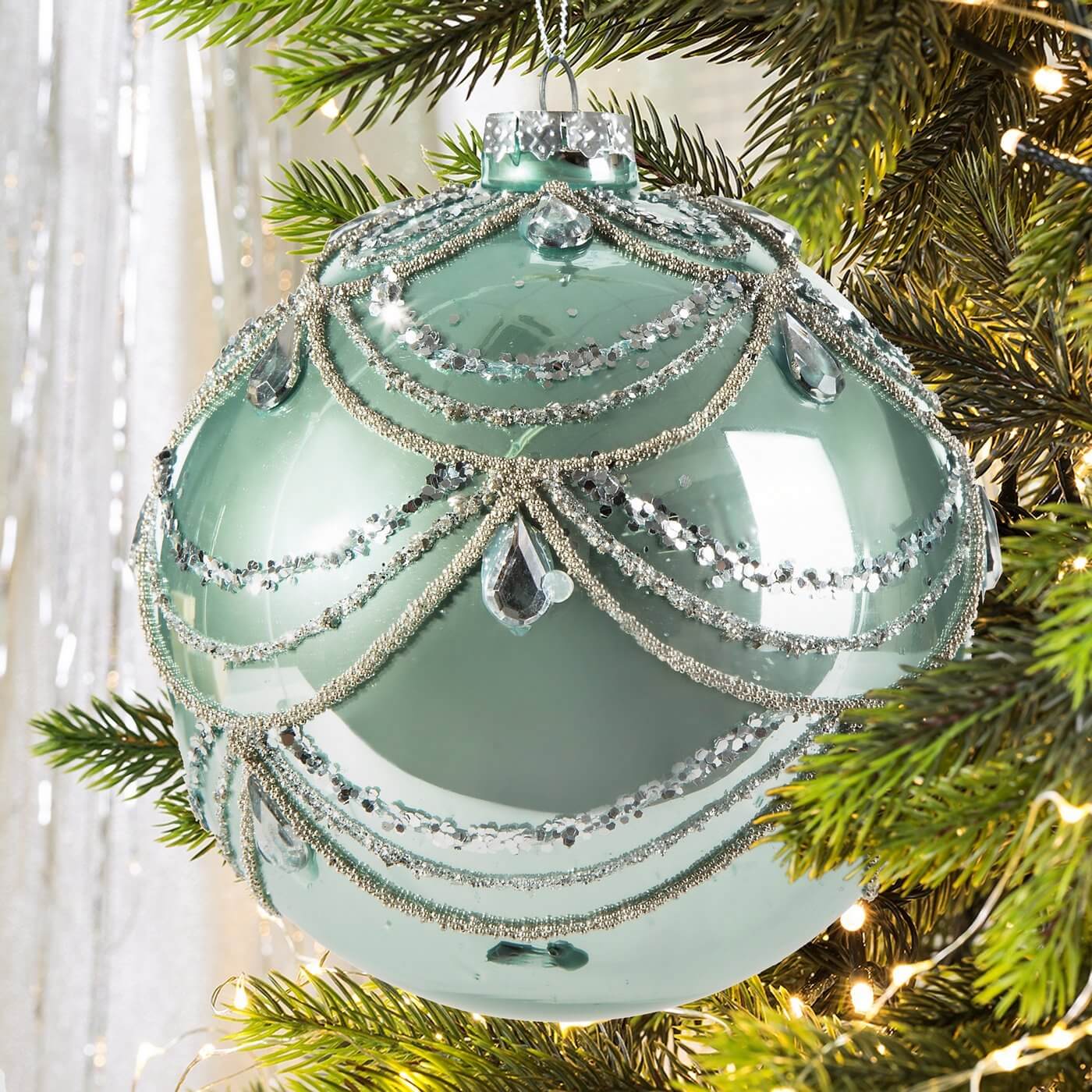 Miętowa bombka choinkowa ręcznie zdobiona brokatowym wzorem w stylu art deco i kryształkami
