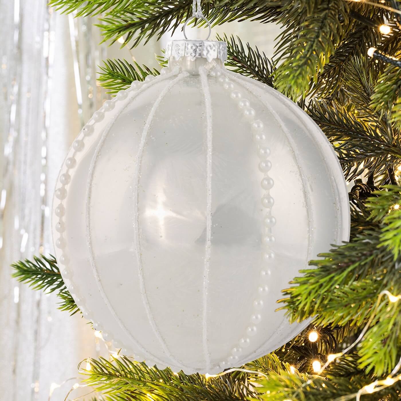 Biała bombka choinkowa zdobiona brokatem i perłowymi koralikami
