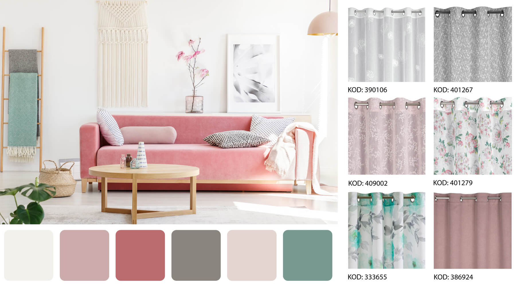 Zieleń odpręża i relaksuje. Zieleń może przybierać różne odcienie. Od ciemnej butelkowej zieleni, po odcienie pastelowe, oliwkowe, miętowe czy szmaragdowe. Ciemnozielona kanapa w salonie przyciąga wzrok. Co pasuje do takiej kanapy? Jak dobrać zasłony do kanapy w salonie? Chcesz zaaranżować spokojną, harmonijną przestrzeń w salonie, do odpoczynku i relaksu? Wybierz do zielonej kanapy dodatki w kolorze brązu. Szczególnie współgrają ze sobą karmelowy brąz i oliwkowa zieleń. Do tego meble i dodatki z naturalnego drewna. Taka kolorystyka w salonie ukoi nasze zmysły i odpręży. A może marzy ci się odrobina ekstrawagancji w salonie? Róż to połączenie elegancji i romantyczności. Pudrowy róż i butelkowa zieleń to zestawienie urzekające. Wykorzystaj zasłony i poduszki w odcieniach różu. Pudrowe tekstylia ocieplą nowocześnie urządzony salon. Połączenie różu i zieleni sprawi, że wnętrze zyska oryginalny look.