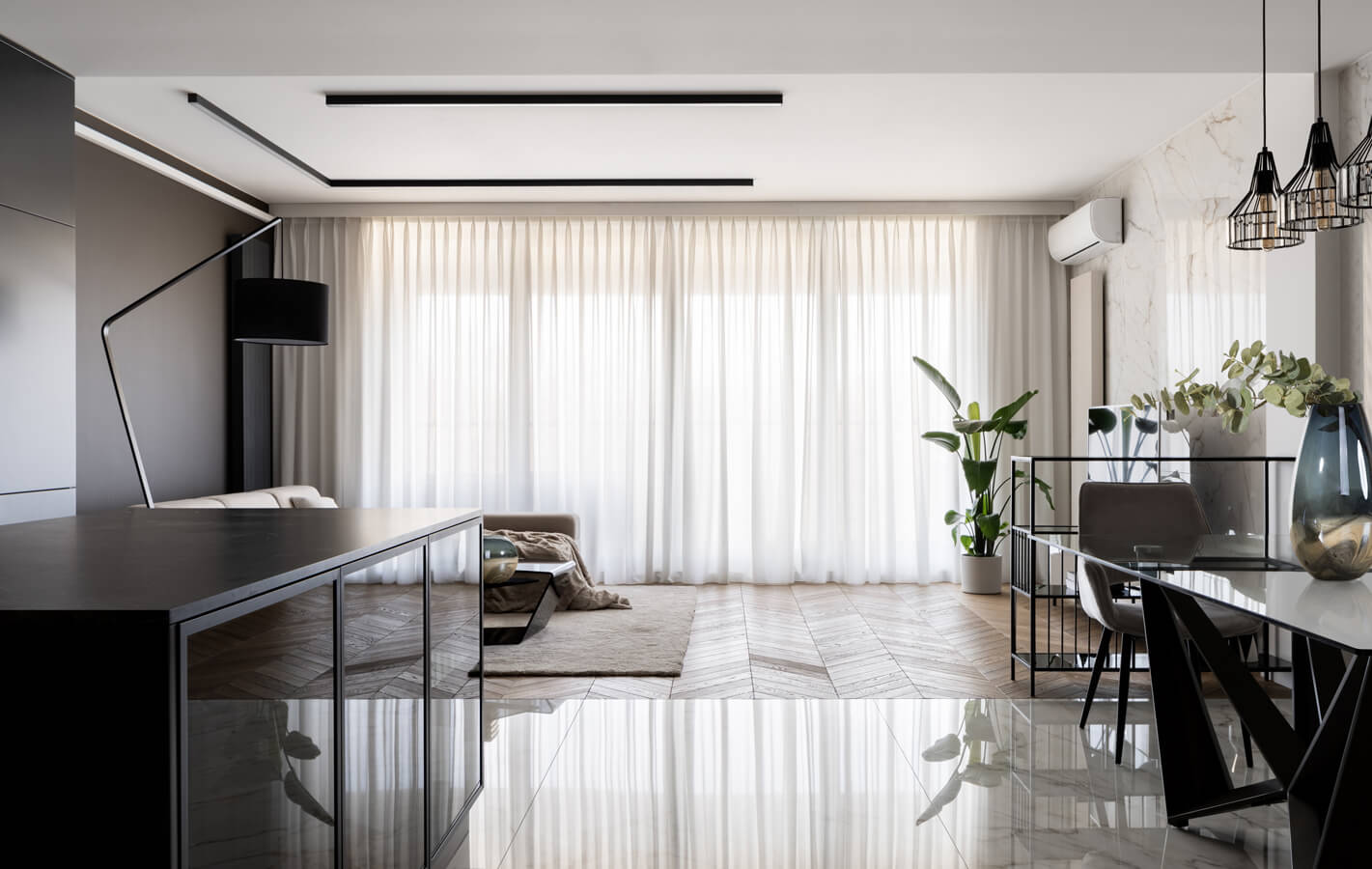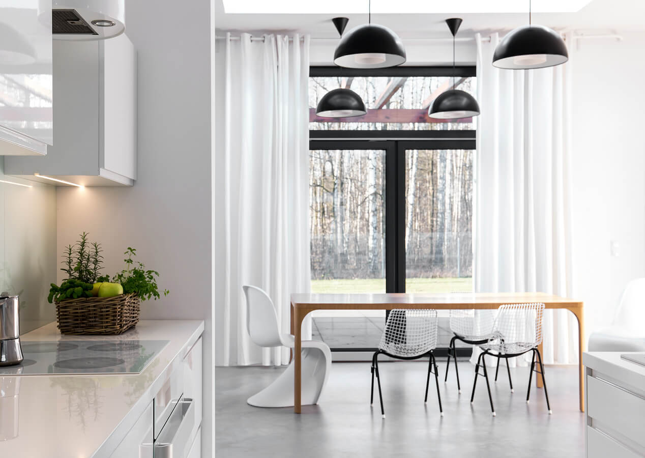 Karnisz lub szyna sufitowa na szerokość całej ściany to idealny pomysł, kiedy chcemy optycznie powiększyć wnętrze. Firana i zasłony rozciągnięte na szerokość całej ściany z oknem bądź oknami pięknie poszerzy pomieszczenie. Taka dekoracja okna dodatkowo doda aranżacji elegancji, stylu i modnego charakteru. Karnisz na całą ścianę pozwoli nam też wyrównać symetrię wnętrza. Okaże się to pomocne zwłaszcza w przypadku, kiedy odległości od okna do rogu ściany są różne po każdej ze stron.