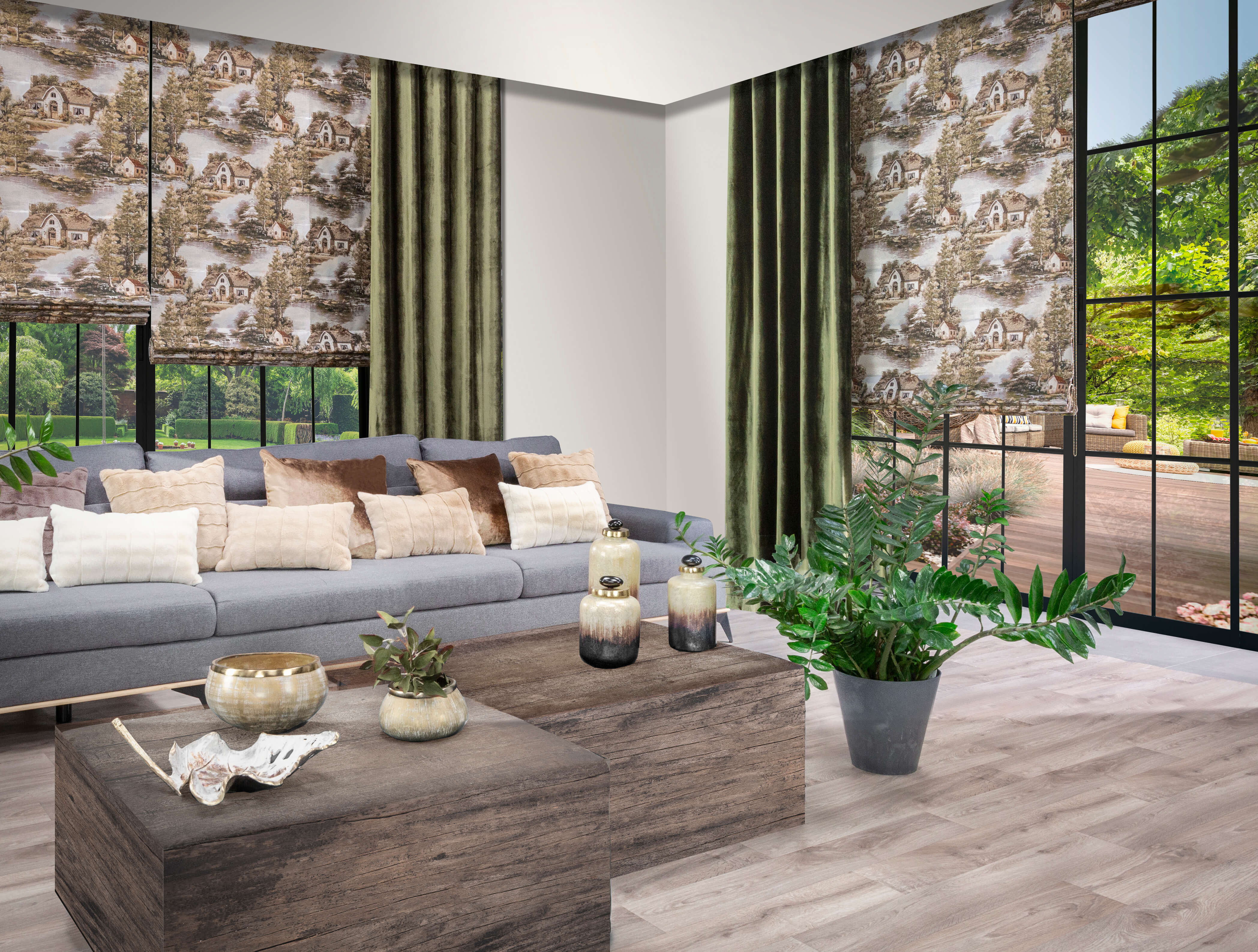 Rolety i zasłony w salonie mogą stanowić neutralne i estetyczne tło dla reszty dodatków. Ale mogą również grać pierwsze skrzypce w aranżacji naszego salonu. Roleta z motywem wiejskiego domu, pośród lasów, przyciąga uwagę, daje wydźwięk całej stylizacji. Wnętrze nabiera charakteru vintage. Do tak efektownych rolet pasują welwetowe zasłony o aksamitnej strukturze. Oliwkowa barwa zasłon wspaniale komponuje się z jasną podłogą i drewnianymi stolikami. Współgra również z elegancką i stylową ceramiką ze złotymi dodatkami. Jak widzisz wzorzyste rolety to bardzo ciekawa i oryginalna dekoracja okna, to doskonały wybór do salonu. Nie obawiaj się eksperymentować.
