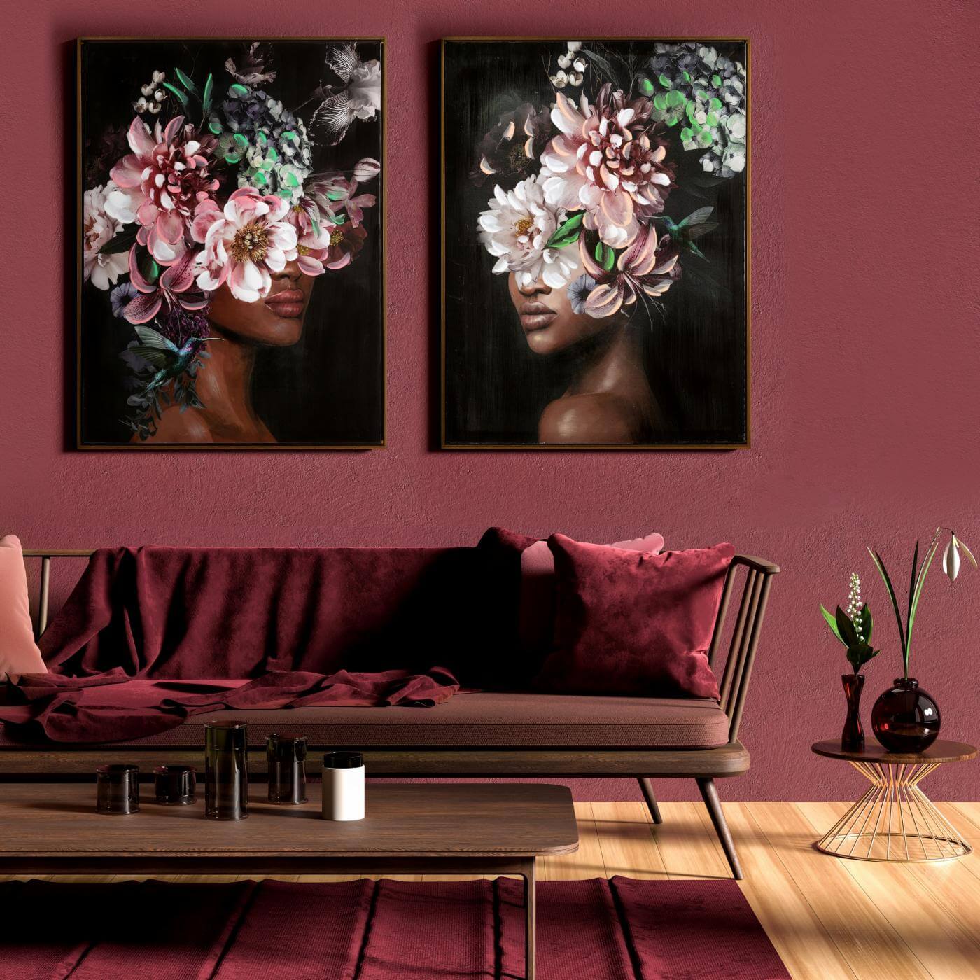 Piękne obrazy kształtują wnętrze. Dlatego warto poświęcić dłuższą chwilę na skomponowanie idealnej aranżacji ściennej. Niezależnie od tego jaki to rodzaj obrazów, aby mogły się dobrze prezentować, należy znaleźć idealne miejsce do ich zawieszenia. Tym idealnym miejscem może być pusta ściana w salonie, miejsce nad łóżkiem w sypialni albo przestrzeń nad stołem w jadalni. Dwa obrazy przedstawiające portrety kobiet, zwrócone do siebie twarzą, z kwiatowym nakryciem głowy, idealnie dopełnią pustą przestrzeń nad stołem jadalnianym. Takie obrazy to wyróżniający się akcent w pomieszczeniu, mają w sobie tajemnicę, intrygują i przyciągają wzrok. Warto w ten sposób ozdobić miejsce nad stołem.