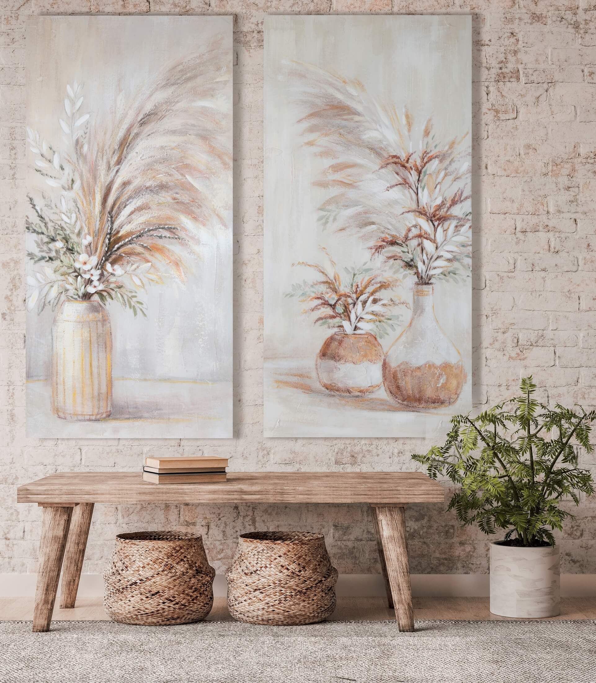 Obrazy z sentencjami, grafiki, idealnie dopełnią wnętrze z metalowymi lampami w stylu industrialnym. Wysokie, ręcznie malowane obrazy na płótnie, przedstawiające wazony z bukietami kwiatów i traw pampasowych, wspaniale wkomponują się w aranżacje w stylu boho.