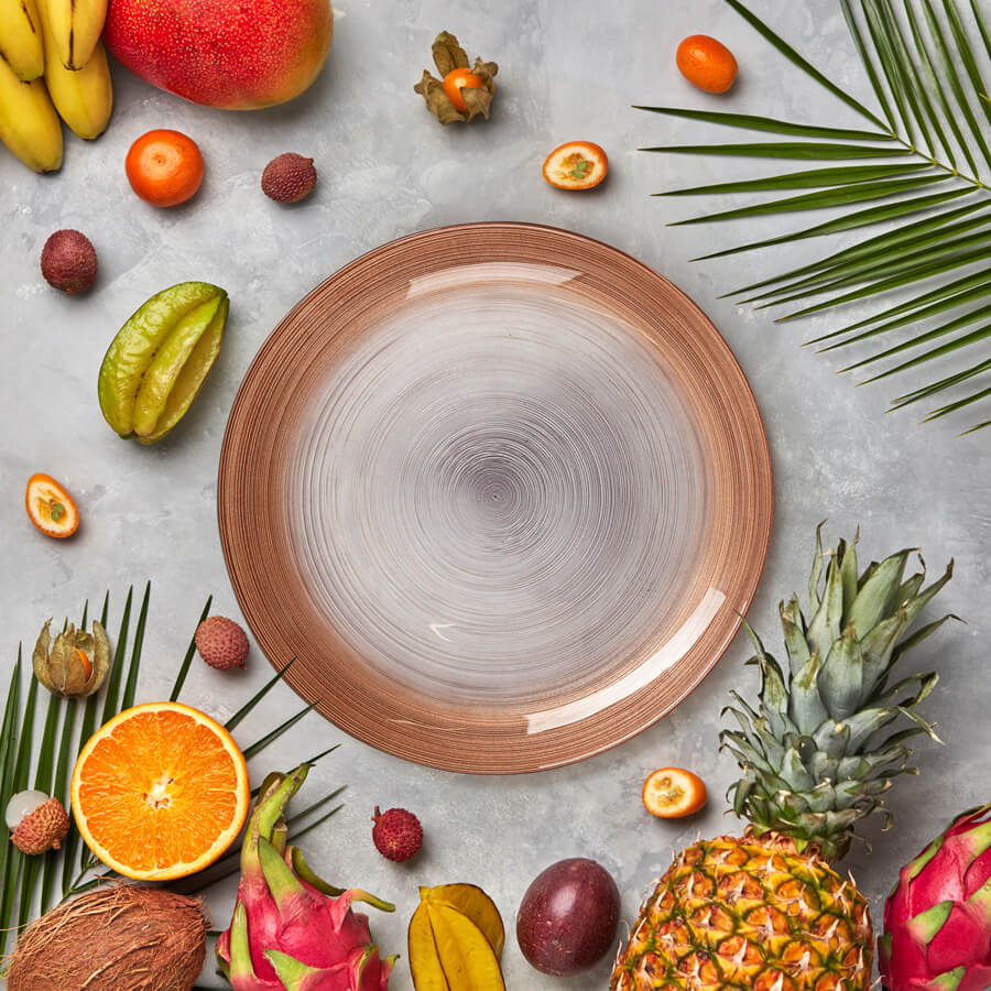 Płaskie talerze szklane świetnie sprawdzają się podczas tworzenia owocowych dekoracji stołu. Wybierz te eleganckie, zdobione, o pięknych barwach i wzorach. Odpowiedni wybór podkreśli całą aranżację stołu. Mamy naczynie, to bierzemy się za owoce. Dokładnie je umyj, osusz i odpowiednio pokrój. Owoce cytrusowe dzielimy na cząstki lub kroimy w kółka, jabłka i gruszki kroimy na 4 lub 6 części i usuwamy gniazda nasienne. Warto owoce skropić sokiem z cytryny, aby nie ciemniały. Banany i kiwi obieramy ze skórki i kroimy na plasterki, morele i brzoskwinie kroimy na części i usuwamy pestkę. Mango, melon, arbuz, kroimy w kostkę lub specjalną łyżeczką wykrajamy kulki. Jeśli owoce mamy już przygotowane, możemy układać nasz owocowy talerz. Na środku układamy mango pokrojone w kostkę, a wkoło układamy owoce pokrojone w plastry: banany, kiwi, pomarańcze, do tego cząstki gruszki i ananasa. Dodajemy pokrojone czerwone truskawki, soczyste maliny i pestki granatu. Jeszcze tylko kilka listków świeżej mięty i nasz imprezowy talerz owocowy gotowy.