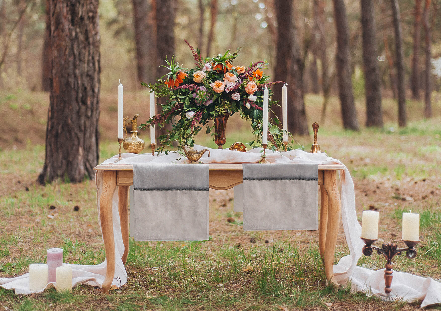 Aby dodać aranżacji wyjątkowego charakteru, możesz dołożyć do tego ułożony wzdłuż długości stołu wąski pas delikatnego, białego materiału, który będzie po obu stronach swobodnie opadał na ziemię. Do takiej stylizacji doskonale pasowały będą dodatki w kolorze mosiądzu – np. wazony i pojedyncze świeczniki. Taka aranżacja z pewnością nie pozostanie niezauważona przez Twoich gości, a przyjęcie nabierze stylowego charakteru.
