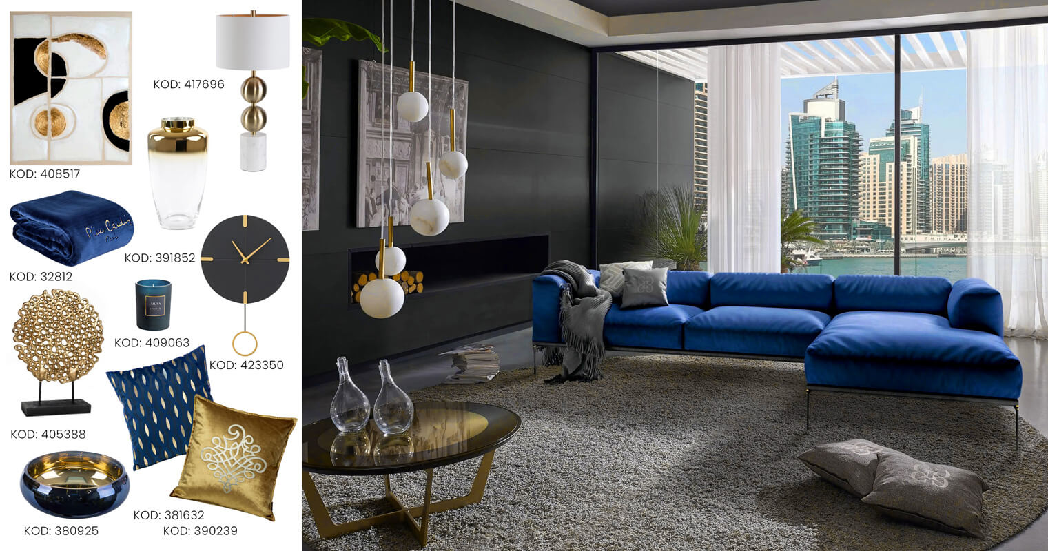 Intensywne barwy przyciągają wzrok, odmieniają, ale też przyjemnie otulają wnętrze. Wyglądają doskonale w salonie. Tapicerowana kanapa w kolorze granatu, z aksamitnego, przyjemnego w dotyku materiału, prezentuje się zjawiskowo. Granat stworzy stylową aranżację w połączeniu ze złotem. Dlatego do naszej aranżacji z granatową kanapą dobraliśmy elegancką wiszącą lampę ze złotymi elementami. Na komodzie również postawiliśmy lampę z kulami w kolorze złota. Kolor ten również pojawia się na abstrakcyjnym obrazie zawieszonym na ścianie. Ceramika została dobrana tak, aby podkreślała charakter pomieszczenia. Do kanapy oczywiście obowiązkowe dodatki – czyli poduszki, pledy i koc. Całość tworzy bardzo przytulny nastrój, szczególnie w zestawieniu z czarnym kolorem ścian i szarym dywanem na podłodze. A jak zaaranżować wnętrze z zieloną kanapą?