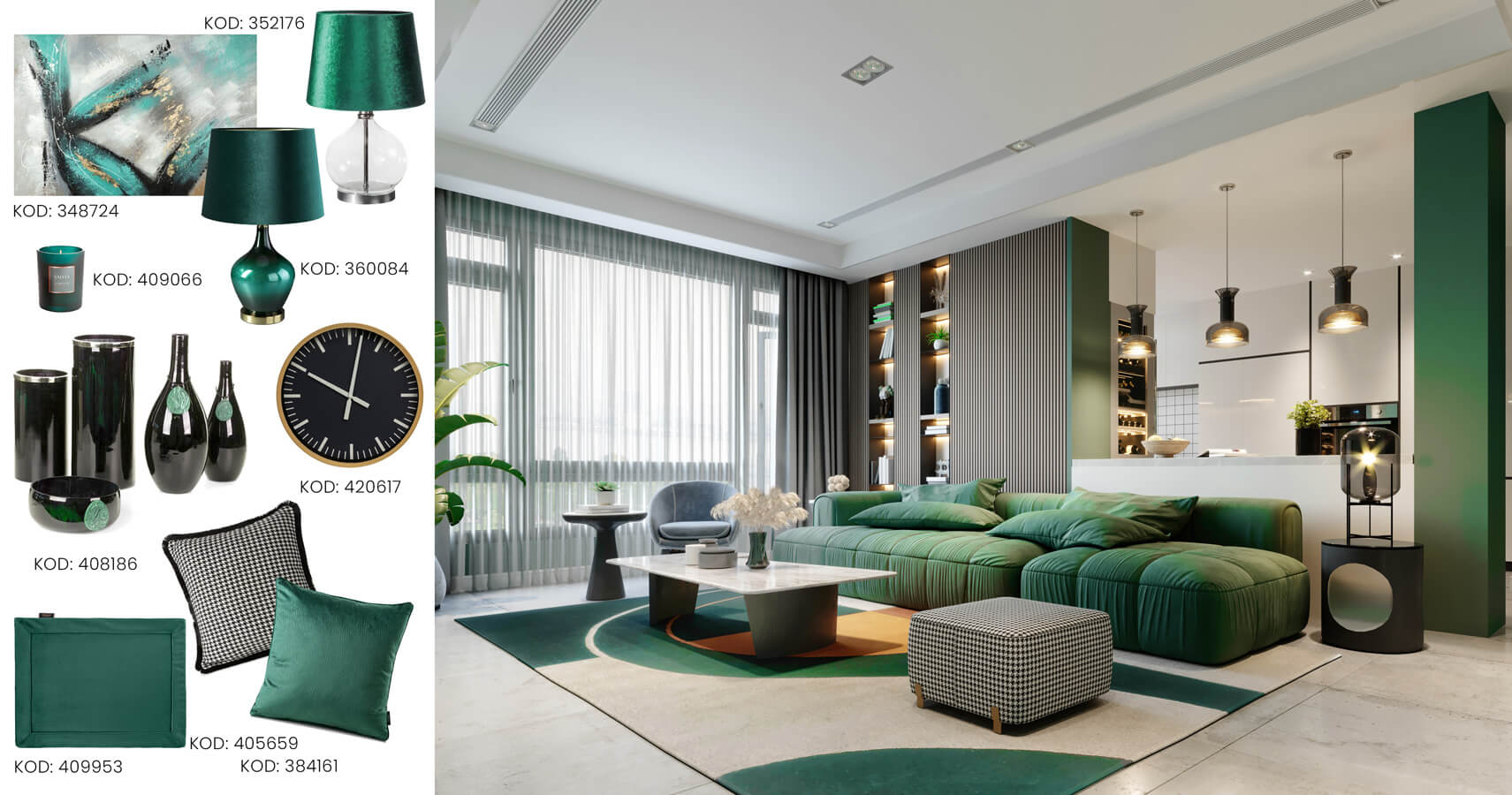 Zieleń króluje w naszych wnętrzach już od dawna. Jest bardzo modna. Kolor zielony kojarzy się z naturą, działa na nas relaksująco, wycisza i uspakaja. Meble wypoczynkowe w odcieniach zieleni prezentują się obłędnie. Soczysta lub butelkowa zieleń doskonale współgra z ciepłymi, subtelnymi beżami. Głębsze odcienie zieleni natomiast, warto połączyć z czernią lub szarością. I takie właśnie kolory wykorzystaliśmy w naszym salonie z zieloną kanapą. Postawiliśmy na nowoczesną, elegancką, ale bardzo prostą w formie lampę stołową JOY. Pękata szklana podstawa z przeźroczystego szkła i metalu skomponowana jest z abażurem z lśniącej welwetowej tkaniny w intensywnym odcieniu zieleni. Na ścianie zawisł oryginalny, duży, dworcowy zegar. Złota obudowa kontrastuje z czarnym cyferblatem i białymi wskazówkami – świetnie pasuje do minimalistycznych wnętrz. Uzupełnieniem aranżacji jest ceramika – wazony i misy ze szkła artystycznego z malachitową zawieszką z kolekcji CAPRI. Poduszki i eleganckie świece, nadadzą wyjątkowego charakteru pomieszczeniu. A czy miodowa kanapa to dobry wybór?