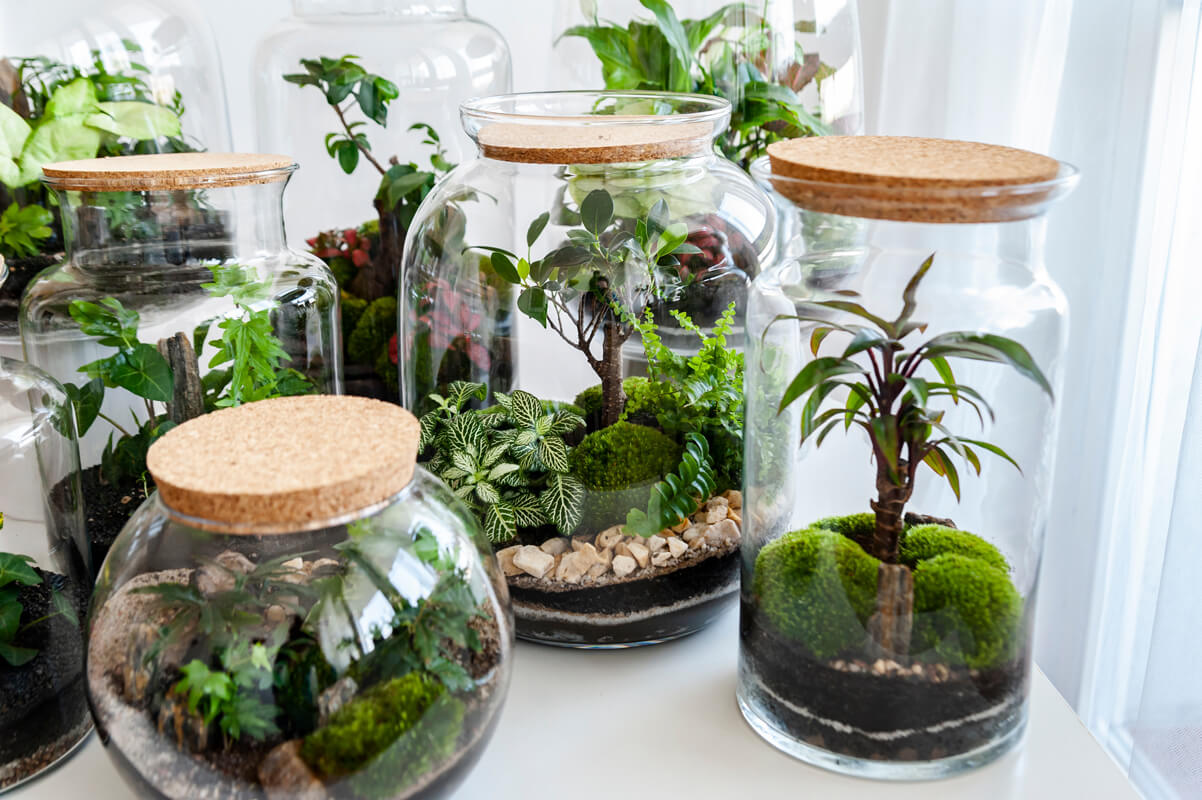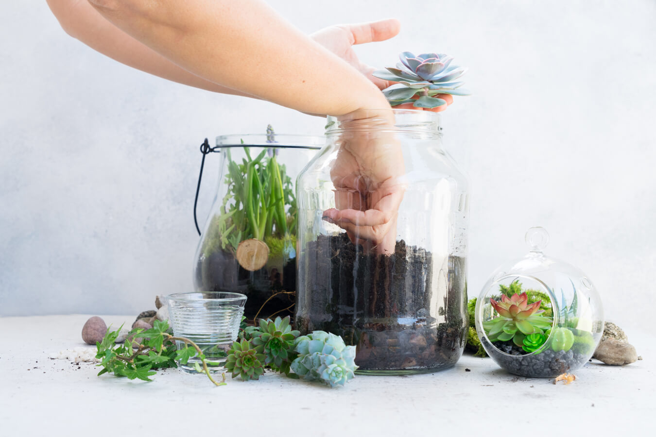 Najpierw musisz przygotować naczynie, w tym przypadku słoik. Umyj dokładnie słoik i wysusz. Następnie przygotuj odpowiednio podłoże. Na dno słoika najpierw wsyp żwirek drenażowy. W kolejnym kroku, na spodzie słoika powinna znaleźć się warstwa ziemi. Następnie możesz wysypać ozdobny pasek żwirku, blisko ścianek słoika i kolejną warstwę ziemi. Przed posadzeniem roślin dobrze też jeszcze raz oczyścić ścianki słoika z ewentualnych zabrudzeń. Teraz możesz przejść do sadzenia wybranych przez siebie roślin. W ładnym ułożeniu dekoracji pomoże Ci pęseta. Kiedy sadzonki znajdą się już na swoim miejscu, całość możesz wypełnić mchem lub dekoracyjnymi kamyczkami. Teraz wystarczy jeszcze raz oczyścić słoik i piękna dekoracja gotowa.