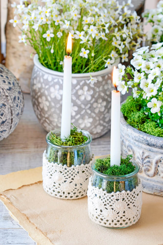 Małe słoiczki to także doskonały pomysł na stworzenie urokliwych świeczników. Z zewnątrz słoiczki możesz udekorować np. oklejając ją wyciętą ze starej firany czy obrusu koronką. Do środka nasyp drobnych kamyczków bądź żwirku. Dzięki temu umieszczona w słoiku świeca będzie stać stabilnie. Wnętrze możesz udekorować kolorowymi, drobnymi kamykami lub mchem. Ja postawiłam na zieleń, żeby wprowadzić do wnętrz wiosenny klimat. Takie świeczniki zaprezentują się niezwykle efektownie i oryginalnie. Możesz wykorzystać je np. do dekoracji stołu podczas zbliżających się Świąt Wielkanocnych. Z pewnością uzupełnią twoją aranżację stołową o powiew wiosennej świeżości.