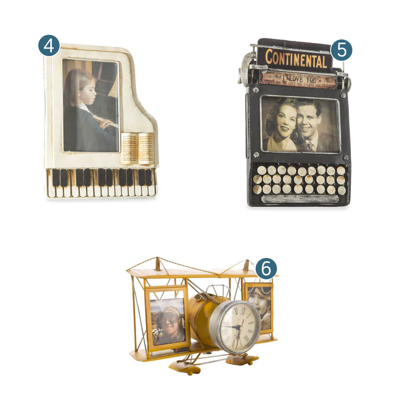 na zdjęciu: 4. ramka na zdjęcia KIM fortepian w stylu retro, 5. ramka na zdjęcie KIM zabytkowa maszyna do pisania oraz ramka KIM