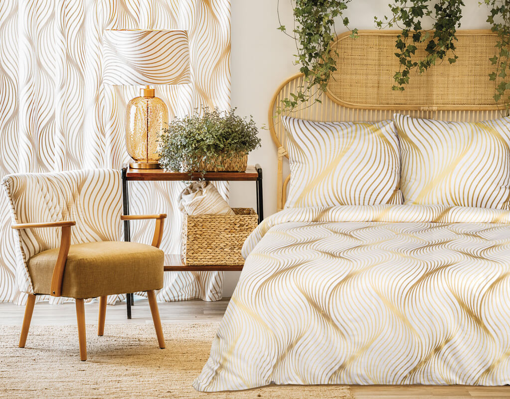 Kolekcja BLANCA to połączenie niewinnej bieli z elegancją i wyrafinowaniem złota. Złote nadruki w postaci regularnych prostych form prezentują się naprawdę obłędnie na wysokogatunkowych tkaninach. Kolekcje tworzą także dodatki z modnym nadrukiem w formie liści lii wodnych, które pięknie podkreślą nowoczesny charakter trendy sypialni. Szukając dodatków do białej sypialni zacznij od łóżka. Tu warto wybrać klasyczną, miękką w dotyku białą pościel zdobioną złotym wzorem. Aranżację łóżka uzupełnią poduszki dekoracyjne ze złotymi nadrukami oraz eleganckie i miłe w dotyku koce i narzuty. Złoty wzór, który pojawi się w stylizacji łóżka możesz powtórzyć w dekoracji okna. Piękne, welwetowe zasłony, zdobione nowoczesnym wzorem w kolorze złota zaprezentują się naprawdę efektownie. Wybrany motyw może pojawić się także na obrazach. Wyjątkowy klimat w sypialni zapewnisz sobie także wybierając efektowne lampy z kolekcji BLANCA czy świecie, które ustawisz na nocnym stoliku. Biel i złoto zaczarują twoją sypialnię – a to wszystko za sprawą kolekcji BLANCA.