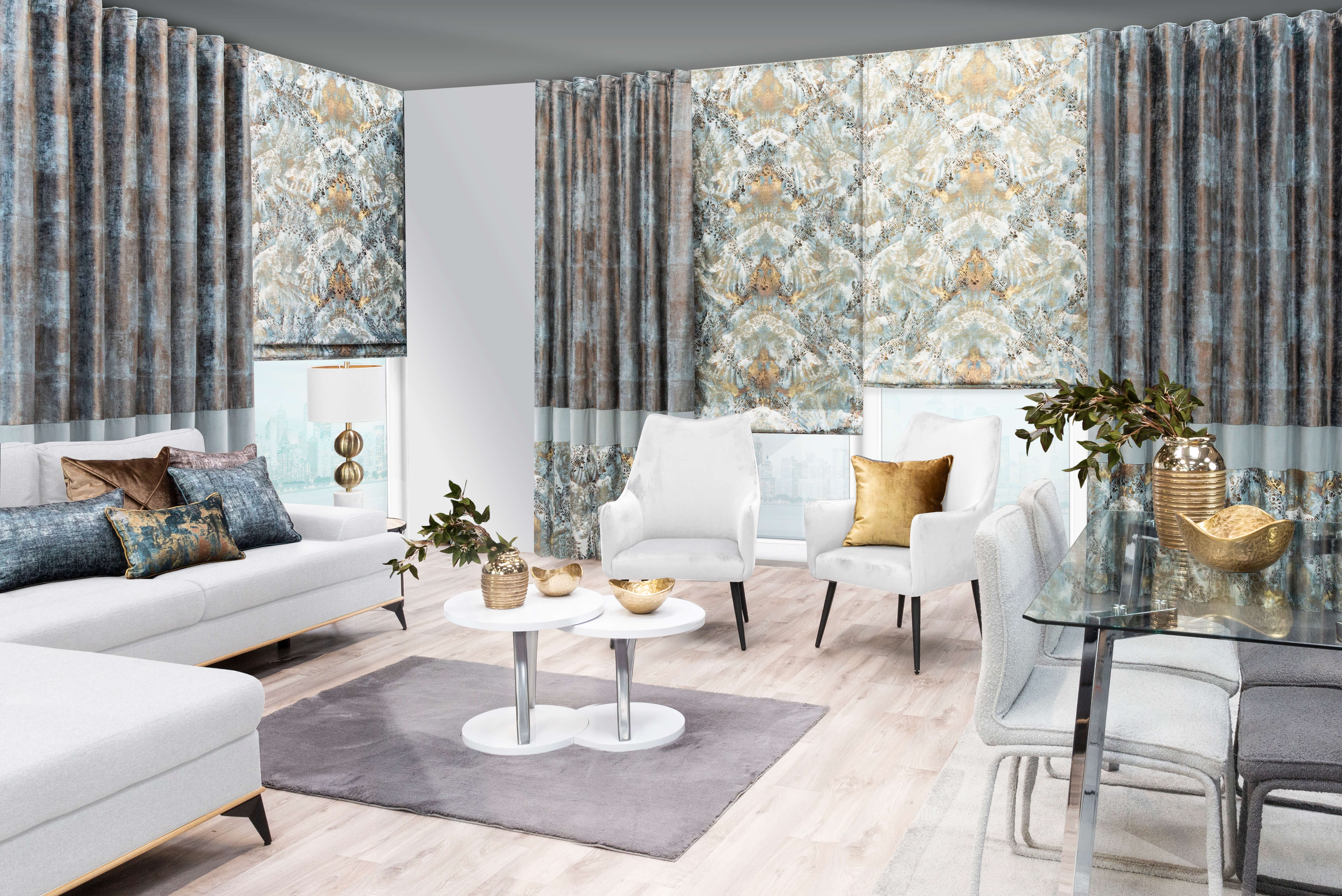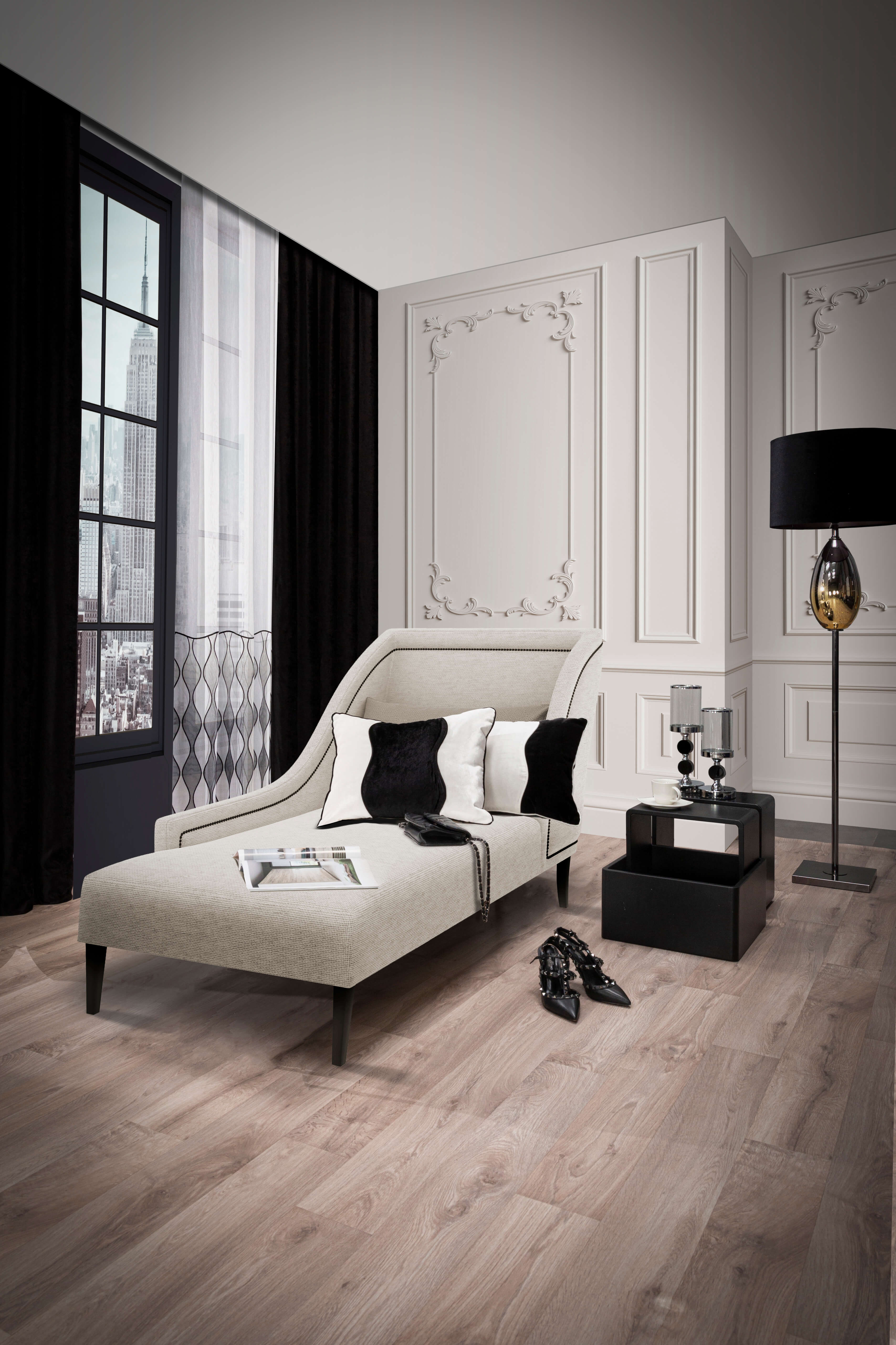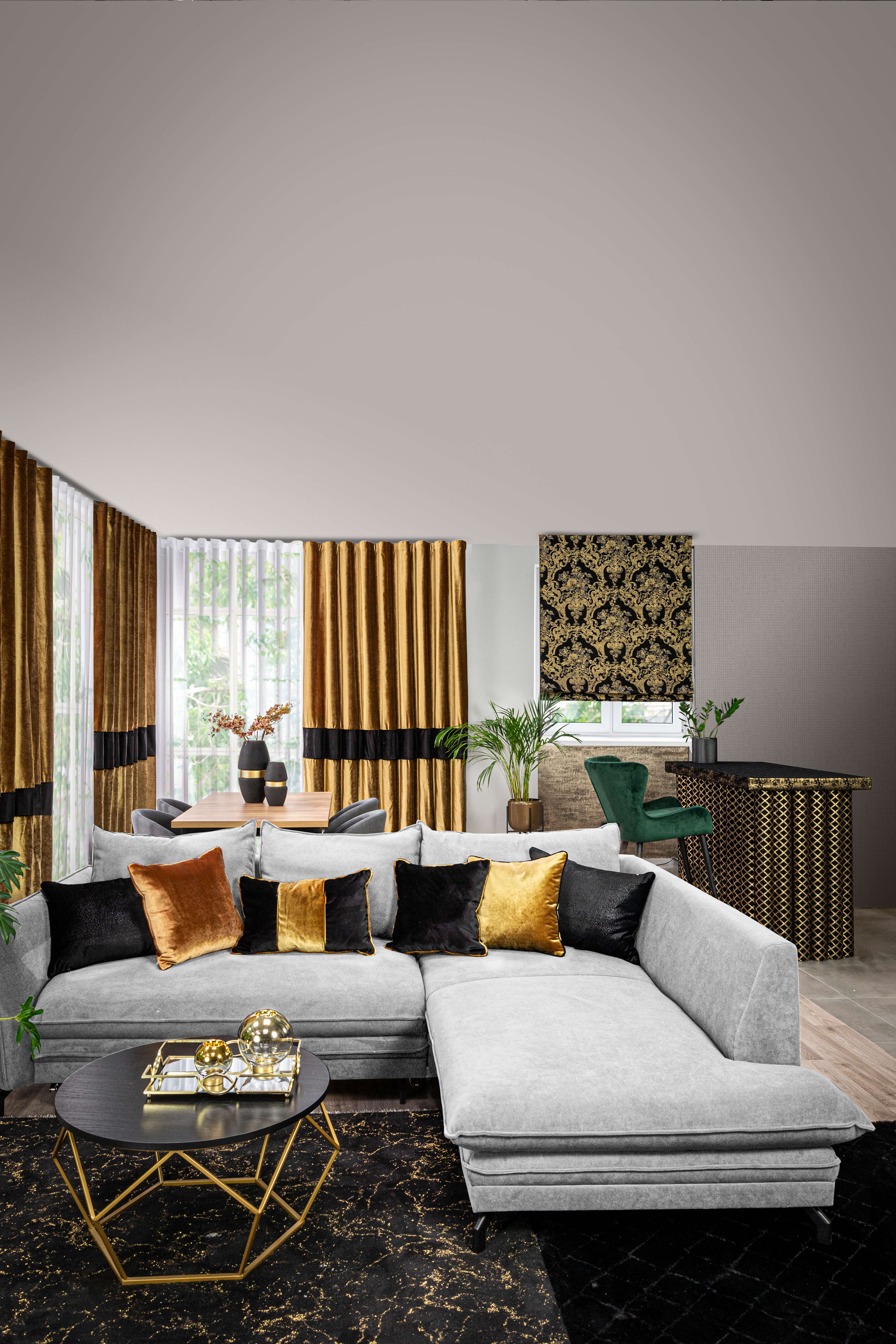 Kiedy skomponujesz już wyposażenie swojego wnętrza, to należy pomyśleć o odpowiednich dodatkach i tekstyliach. Wypróbuj nietypowe połączenie szarości i złota. Złote dodatki i akcenty idealnie zrównoważą surowy charakter szarego koloru ścian. Piękne, długie zasłony w kolorze złota, dekoracyjne poduszki i oryginalny czarny dywan ze złotymi plamkami dadzą świetny efekt. Powstanie bardzo elegancka i zbalansowana aranżacja. Dodatkowo złote elementy wprowadzają do pomieszczenia ciepłe światło i dodają blasku, co nadaje wnętrzu wyjątkowego charakteru oraz optycznie powiększa przestrzeń. Obok koloru ścian, to również podłoga stanowi tło dla jasnych mebli. Zobaczmy, jaki kolor paneli pasuje do jasnych mebli.