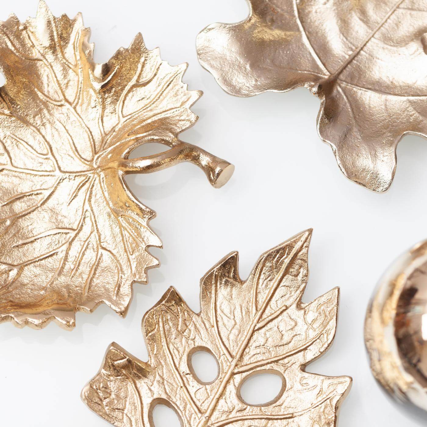 Jako jesienne dekoracje polecam również paterę SAVA wykonana ze szkła artystycznego w kształcie liścia w pięknym, jesiennym odcieniu pomarańczy, z efektem cieniowania. Dla wielbicieli blasku polecam złotą, metalową paterę DALIA zaprojektowaną w kształcie liści lub paterę dekoracyjną przedstawiającą złoty liść egzotyczny. Motyw liści może stanowić centralny element dekoracyjny jesiennych aranżacji.