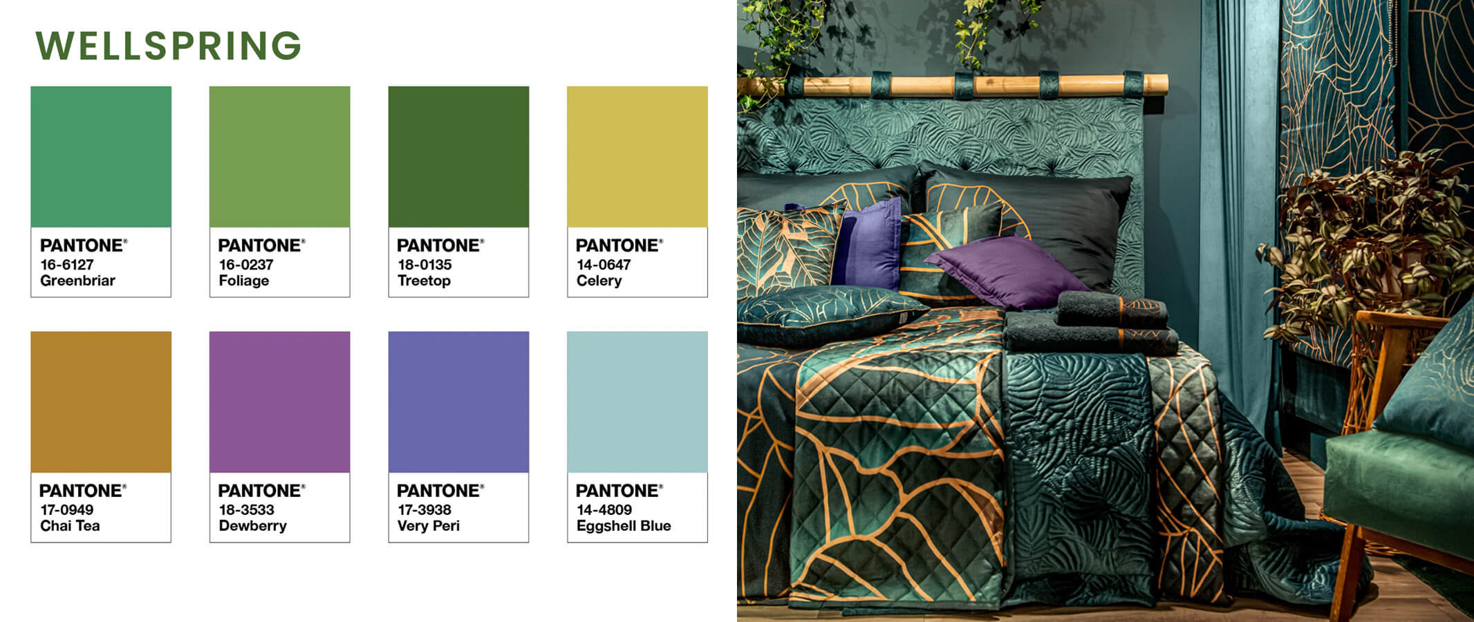 Jeśli lubisz odważne, wyraziste połączenia doskonałym pomysłem będzie połączenie butelkowej zieleni z ciemnym, głębokim granatem. To zestawienie idealnie sprawdzi się np. w sypialni wprowadzając do niej ciepły, przytulny, nastrojowy klimat. Granat na ścianach możesz połączyć z zieloną aranżacją łóżka. Jeśli chcesz dodać wnętrzu przytulności polecam piękne, welwetowe narzuty na łóżko w kolorze ciemnej zieleni.