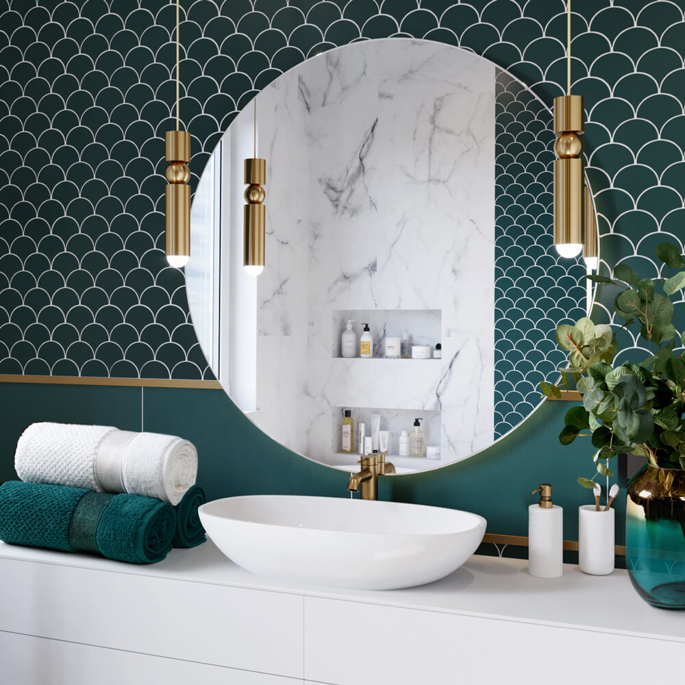 Jeśli chcesz stworzyć wnętrze pełne modnej elegancji i stylu połącz ciemną, butelkową zieleń ze złotem. To zestawienie zaprezentuje się naprawdę efektownie. Złoto i zieleń idealnie zaprezentuje się zarówno w sypialni jak i np. w łazience. Możesz wykorzystać tekstylia w kolorze butelkowej zieleni (narzuty na łóżko, pościel, zielone zasłony) z dodatkami w kolorze złota (ceramika dekoracyjna, lampy, wazony, świeczniki). Możesz też wybrać zielone dodatki, które zdobią wzory w kolorze złota.