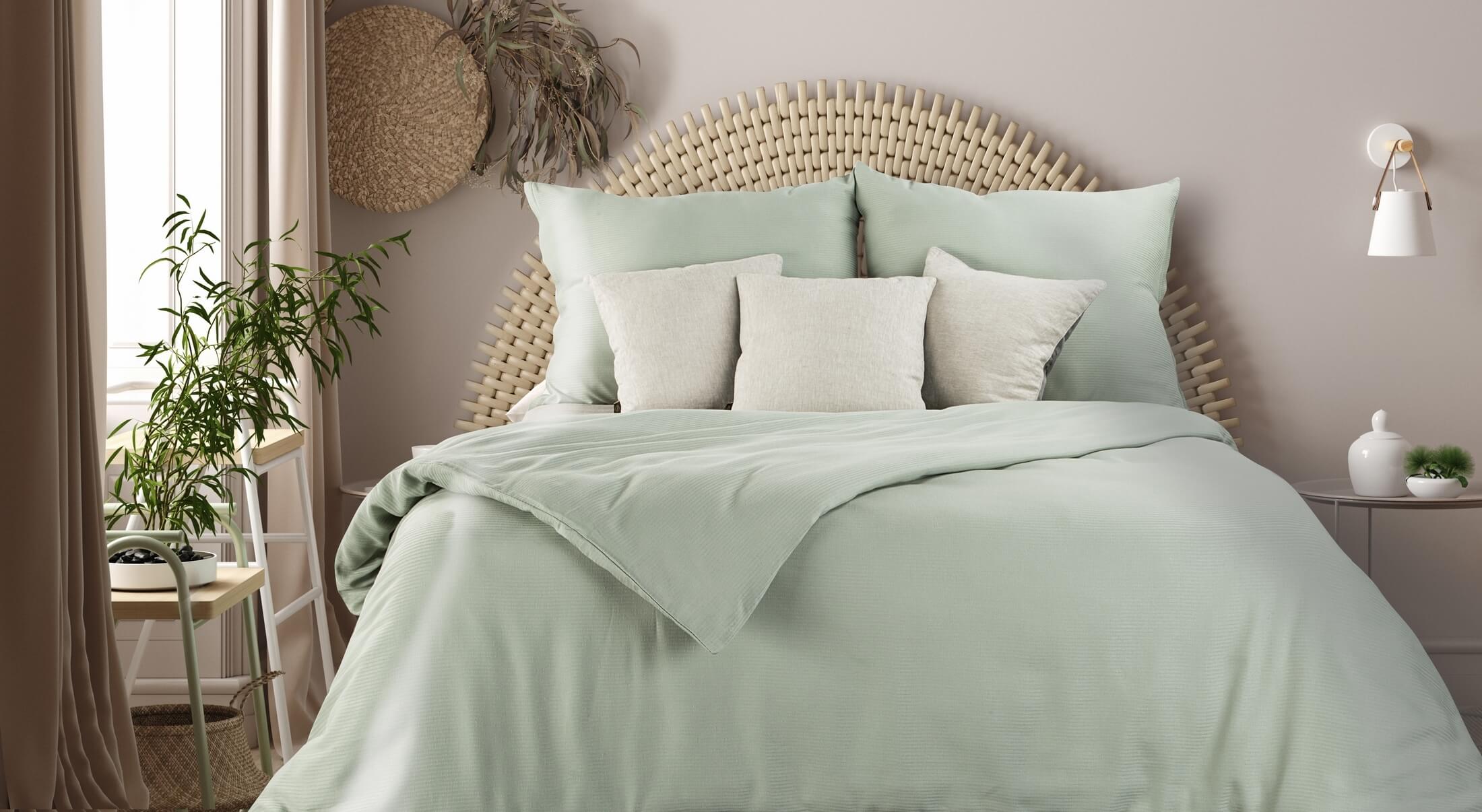 Sypialnia to miejsce, gdzie możemy schować się przed resztą domowników, ukryć się przed hałasem i resztą świata. I nie trzeba nam do tego ogromnej przestrzeni, wystarczy mała, przytulna sypialnia. Ważne jest, aby zbudować w niej intymny klimat. Błogi nastrój zyskasz na pewno z pościelą MONTENEGRO. Gładka pościel z delikatnym prążkiem w kolorystyce jasnej zieleni, wspaniale wyciszy wnętrze. Wniesie spokój i subtelną elegancję. Taka pościel świetnie sprawdzi się w towarzystwie naturalnych barw: bieli lub beżu. Idealnie pasują również do kolorów akcentujących np. do pudrowego różu. Poszewka z welwetu zdobiona na brzegach falbanami doda uroku naszej sypialni. W takiej sypialni czuć atmosferę odprężenia i relaksu.