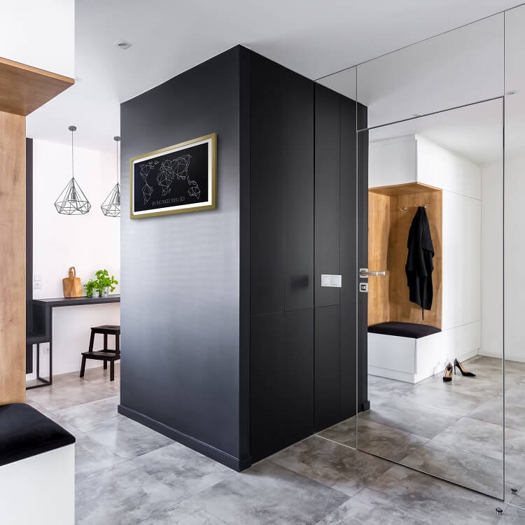 Nie masz pomysłu na ściany w przedpokoju? Najlepiej postawić na modne szarości w połączeniu z bielą! Jeżeli pozwala na to Twój budżet, rozważ także wykończenie z betonu architektonicznego.