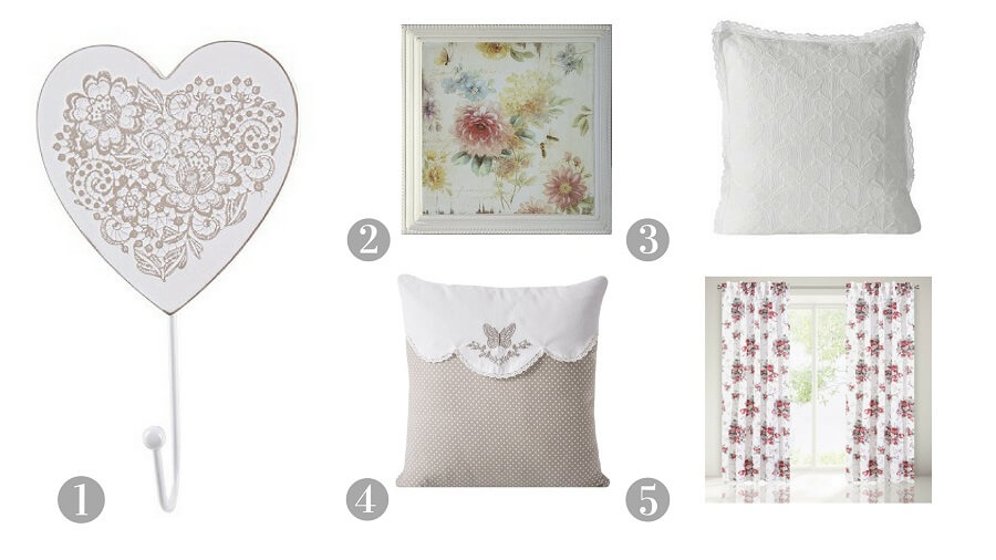 1. Wieszak dekoracyjny Lili 2. Obraz kwiaty 3. Poszewka Carmo 4. Poszewka dekoracyjna Maripos 5. Zasłona gotowa Plant