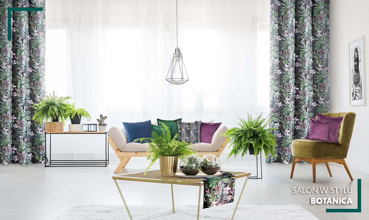 Niezwykle ważne w stylu botanicznym są także motywy roślinne i kwiatowe, które pojawiają się na różnych dodatkach i dekoracjach. Musisz jednak uważać, aby właściwe zestawić ze sobą wzory, by nie wprowadzać aranżacyjnego chaosu. Pamiętaj, że całość ma prezentować się harmonijnie i stylowo. Najbezpieczniejszym rozwiązaniem jest więc wybranie jednego motywu/wzoru, który będzie powtarzał się na kilku dodatkach – np. zasłonach, poduszkach dekoracyjnych i obrusie.