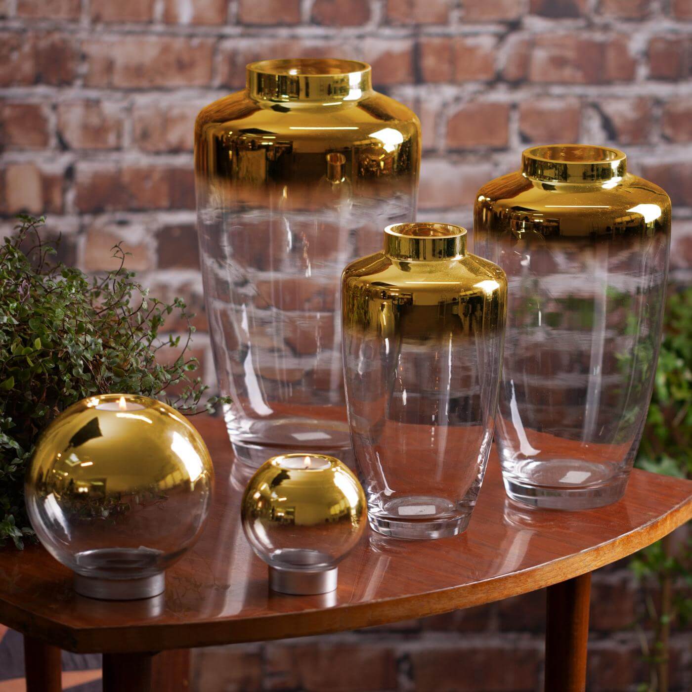 Komplet wypoczynkowy z kremowymi siedziskami i brązowymi poduchami zdecydowanie dodają ciepła, szczególnie, że wyeksponowany jest na ceglanej ścianie. Złagodzić surowość ściany udało się również poprzez zastosowanie obrazów ze złotym nadrukiem liści  w złotej ramie. Dekoracja w kontrastujących brązowo-złotych barwach i w towarzystwie surowej cegły, znakomicie pasuje do wnętrza w stylu soft loft. Domowy klimat nadaje również oryginalny, drewniany stolik, a na nim ustawiliśmy stylowy wazon ze szkła artystycznego w formie walca. Ciepłe brązy, okraszone blaskiem starego złota wspaniale uzupełnią naszą aranżacje. Salon nabrał sznytu, ale nie brakuje w nim przytulności.