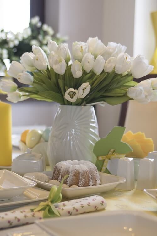 Święta to doskonała okazja do tego, aby nasycić wnętrze kolorami i zapachem świeżych kwiatów (tulipanami, żonkilami i hiacyntami). Będą przysłowiową „kropką nad i”, uzupełniając naszą kompozycję i podkreślając jednocześnie wyjątkową atmosferę. Ustawione w kolorowym wazonie oraz przyozdobione pięknymi dodatkami – wstążkami, piórkami i gałązkami bazi – będą stanowić radosną wielkanocną aranżację.