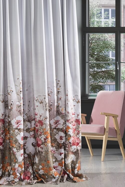 - Użyj tkaniny z motywem kwiatowym na zasłony – zestaw je z gładką firanką.