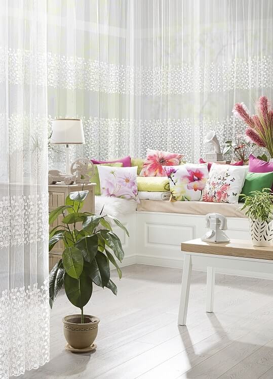 Firany żakardowe nigdy nie wychodzą z mody. Mogą być wykonane z delikatnej, lekko nabłyszczanej przędzy, z nici poliestrowych lub poliestrowych z dodatkiem bawełny. Jest to niezwykle praktyczny materiał, który – podobnie, jak markizeta – nie wymaga prasowania. Ponadto możesz odświeżać je w pralce w niskiej temperaturze z lekkim odwirowaniem. Pamiętaj jednak, że w przeciwieństwie do woalu czy organtyny, żakard dużo szybciej łapie kurz.