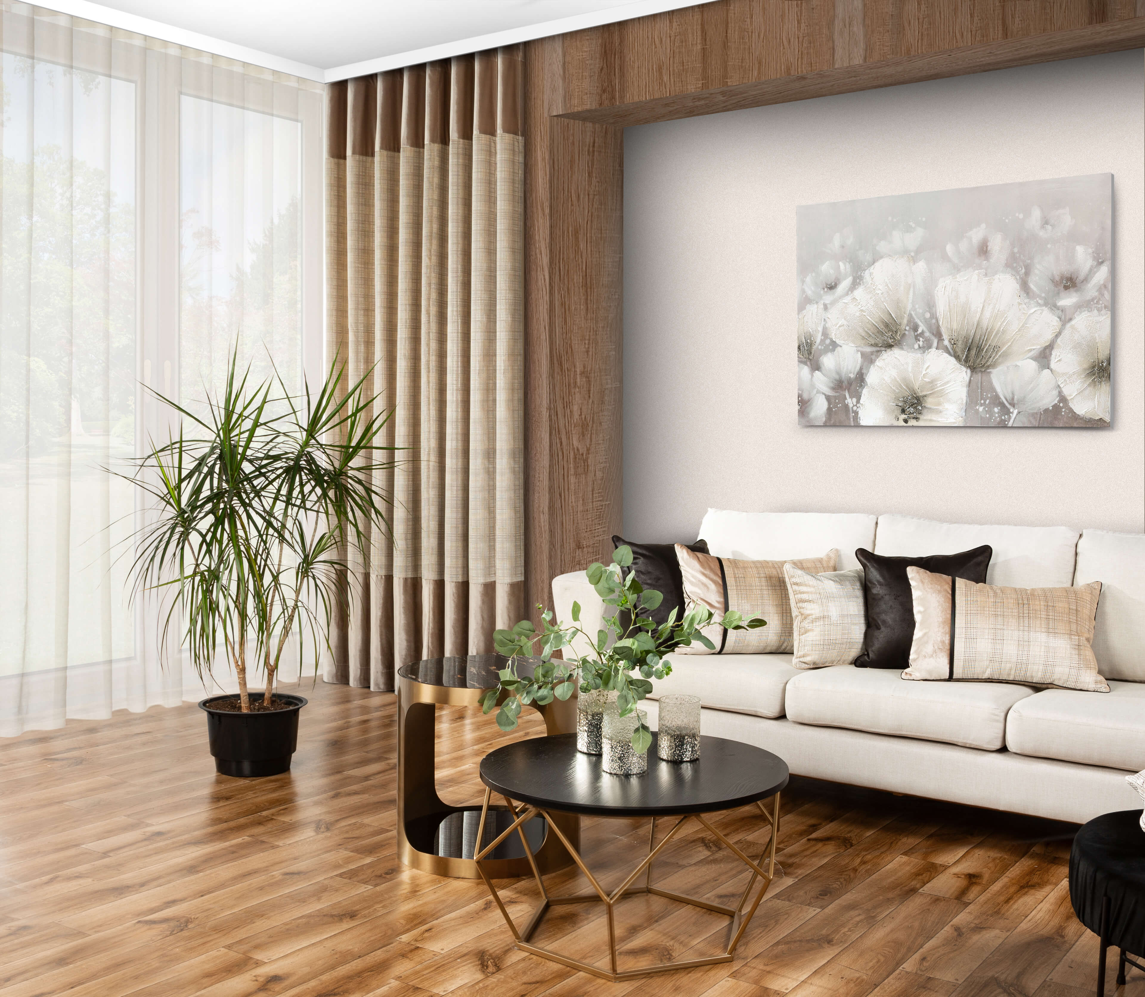 W naszej aranżacji tym wspólnym łącznikiem jest kolor. W klasycznym wnętrzu postawiliśmy na ciepłe odcienie beżu i brązu. Melanż beżu z brązem gwarantuje ciepły, przytulny wystrój. Jasna kanapa pięknie kontrastuje z klasyczną drewnianą podłogą. Również pozostałe meble celowo wybrano w kolorze naturalnego drewna. Duże, jasne okna zdobią długie beżowo-brązowe zasłony. Górna część zasłon w kolorze ciemnego brązu, świetnie komponuje się z kremowo beżowymi barwami, a jednocześnie nadaje charakteru całości. Ożywi i nada wyrazu pomieszczeniu. Dodatkowo elegancji dodają oryginalne rolety rzymskie, wykonane z żakardowej tkaniny, zdobionej wzorem z roślinnymi elementami. Tkanina pięknie się układa, a wnętrze nabiera odświętnego charakteru. Wystarczy dodać kilka delikatnych dodatków, takich jak dekoracyjne poduszki na kanapę oraz postawić na stole ceramiczny wazon z zielonymi gałązkami. Aranżacja robi wrażenie? Te same beżowo-brązowe zasłony wykorzystaliśmy również do salonu w odważniejszych barwach. Zobacz jak tam się sprawdziły.