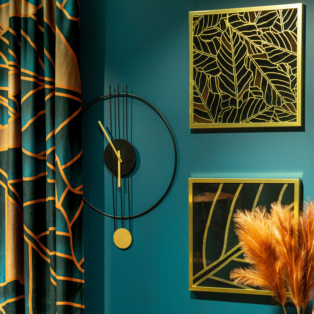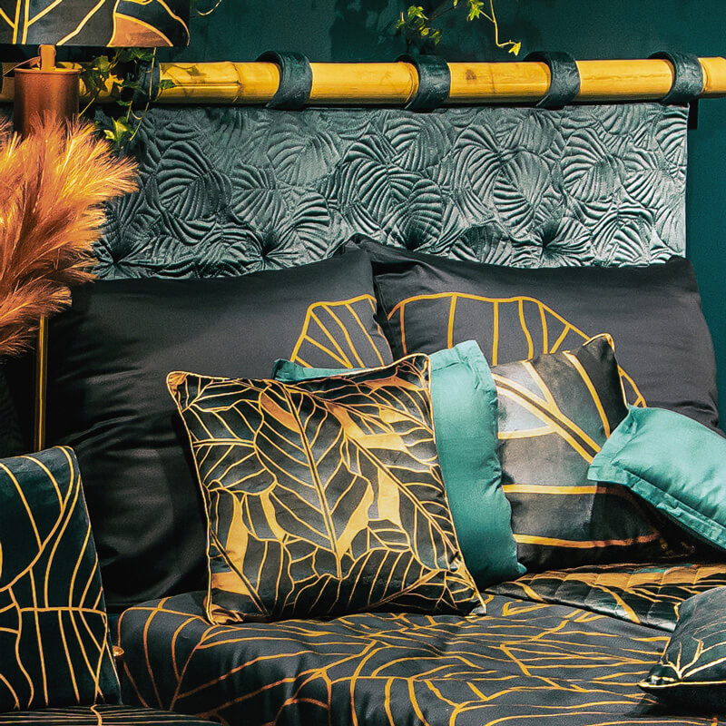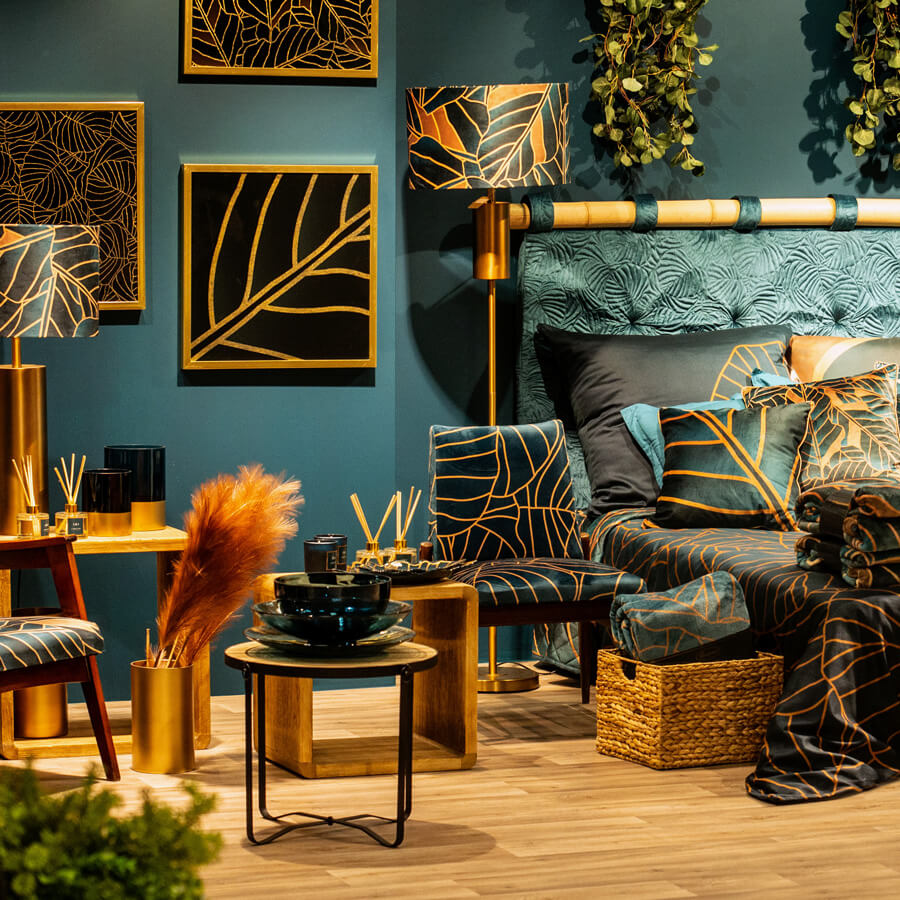Znakiem rozpoznawczym kolekcji LILY jest właśnie ten niepowtarzany, mocny, klimatyczny kolor. Dodatki z tej kolekcji mają barwę ciemnej zieleni wpadającej w odcienie turkusu. Zieleń we wnętrzach wprowadza poczucie elegancji, nadając przy tym aranżacji modnego charakteru. Ciemna, butelkowa zieleń to bowiem wciąż jeden z trendy kolorów. W kolekcji LILY zieleń otrzymuje nowy, świeży błysk i to nie tylko za sprawą turkusowych tonów, które przywodzą na myśl głęboką toń wód. Dodatki z tej serii zostały bowiem udekorowane oryginalnym, botanicznym wzorem w kolorze ciemnego złota.