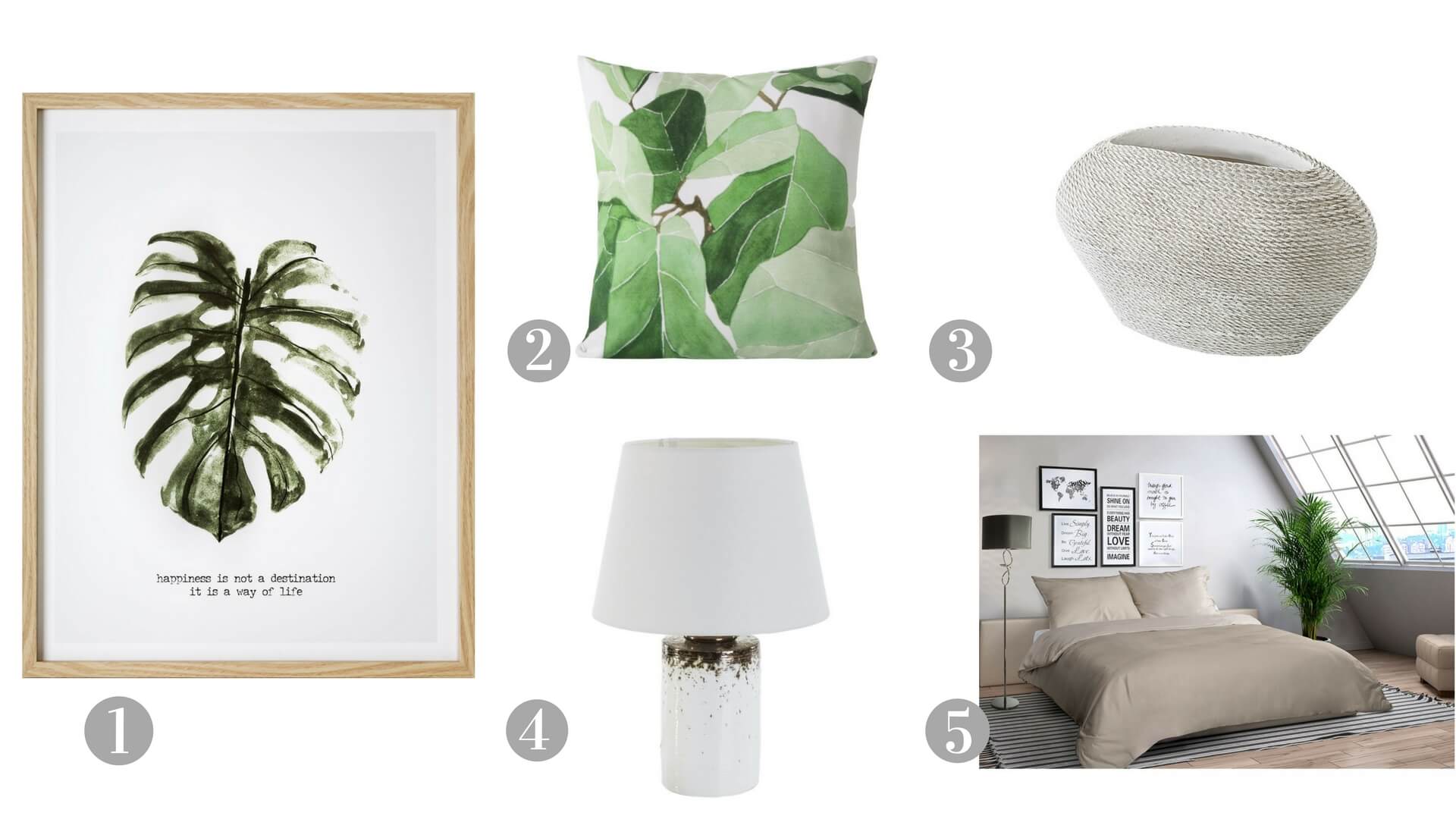 1. Obraz leaf 2. Poszewka dekoracyjna Scarlet 3. Wazon Finesse 4. Lampa dekoracyjna Elie 5. Komplet pościeli Luna