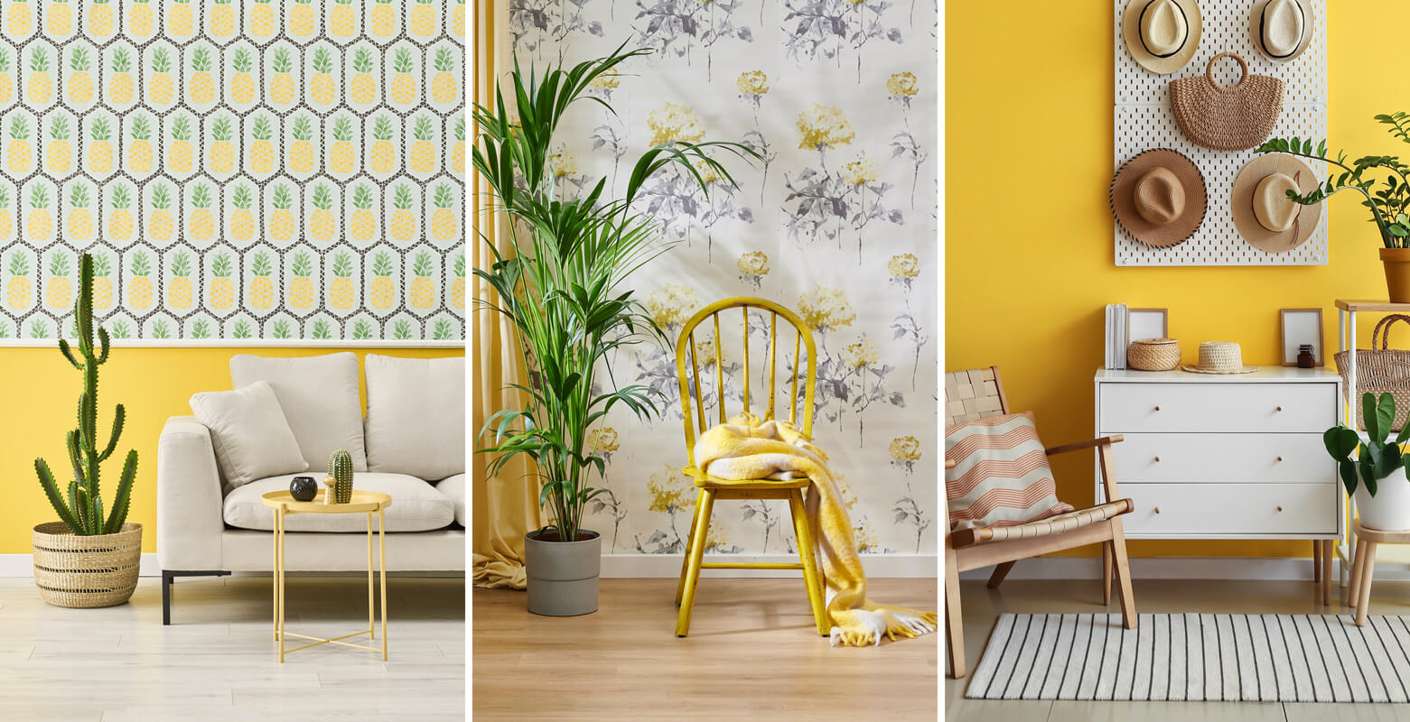 Do takiej aranżacji przydadzą się różne akcesoria i dodatki. Przy kanapie postaw egzotycznego kaktusa umieszczonego w plecionej osłonie oraz nieduży metalowy stolik w kolorze złota. Bardzo oryginalny efekt uzyskasz jeśli na części ściany położysz tapetę w zabawne ananasy w barwach żółci i zieleni – oryginalnie i z pomysłem. Aby żółta ściana nie wyglądała mdło i niejako, watro wyeksponować na niej coś oryginalnego. Może to być na przykład kolekcja naszych ulubionych kapeluszy, przywiezionych z dalekich podróży. Zobacz, co jeszcze pasuje do żółtego.