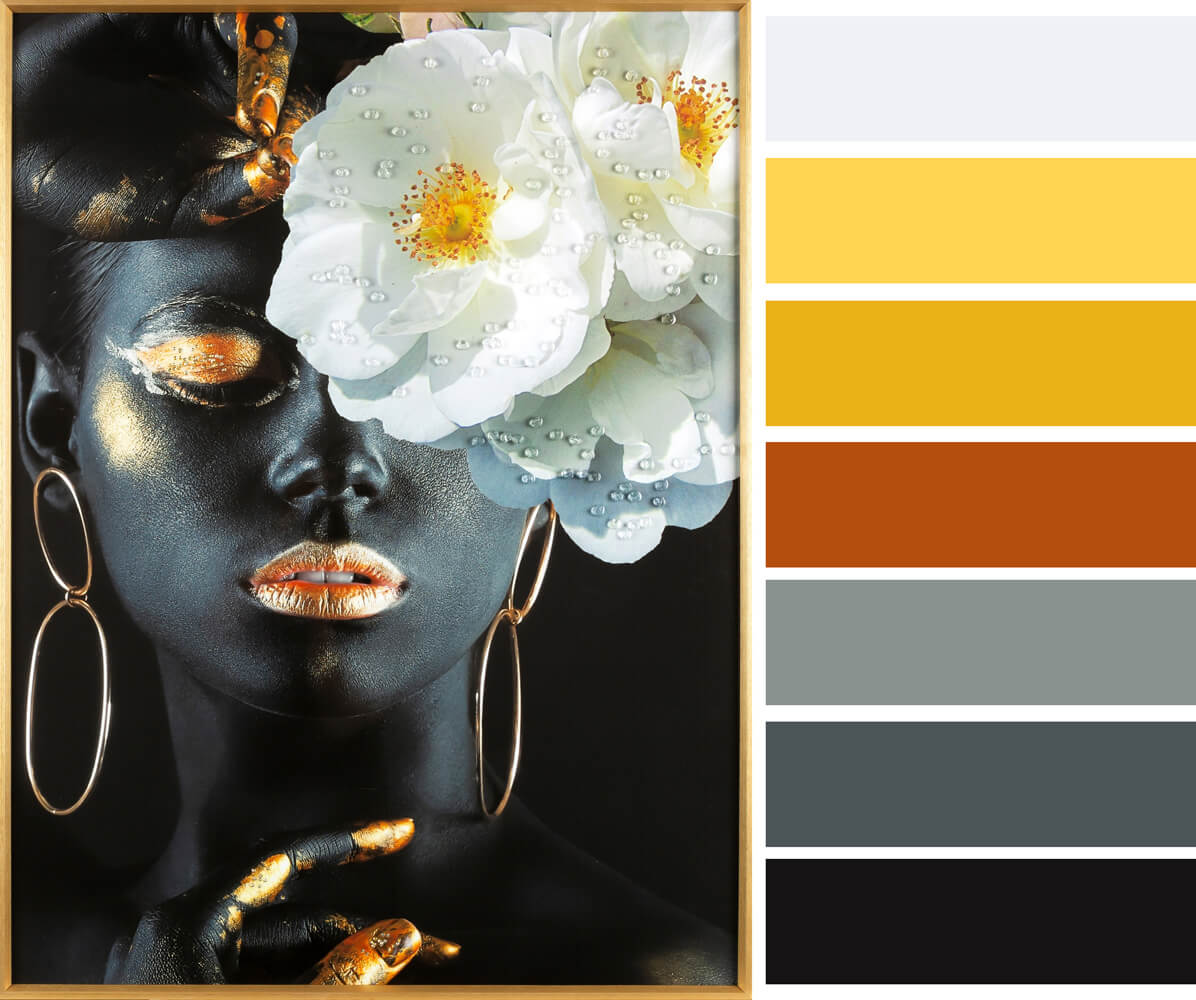 Żółty to intensywna barwa, która potrzebuje odpowiedniego towarzystwa, aby wyglądać efektownie. Chłodne i spokojne odcienie szarości są doskonałą bazą dla energetyzującego żółtego. Ten duet daje bardzo ciekawy i wyrazisty efekt. Z jednej strony stonowana barwa, z drugiej intensywna. Mimo to, powstanie aranżacja subtelna i wyważona. Te dwie barwy świetnie ze sobą kontrastują, wzajemnie podkreślając swoje atuty, a przy tym pasują do wielu stylów wnętrzarskich. Można je łączyć w aranżacja minimalistycznych, skandynawskich i nowoczesnych. Odcień musztardowy w połączeniu z odcieniami szarości świetnie wpisuje się również w estetykę stylu retro. Na żółtej ścianie warto powiesić obrazy w odcieniach szarości i czerni. W naszym sklepie internetowym znajdziesz idealnie pasujący do tej stylizacji portret kobiety w złotej ramie. Ciemne dodatki uspokoją nieco aranżację. Obraz elektryzuje i przyciąga uwagę, nadaje charakteru pomieszczeniu. Uzupełnieniem całej stylizacji, będą ozdobne wazony, misy i świeczniki w kolorze złota. A jaki kolor jeszcze pasuje do żółtego?