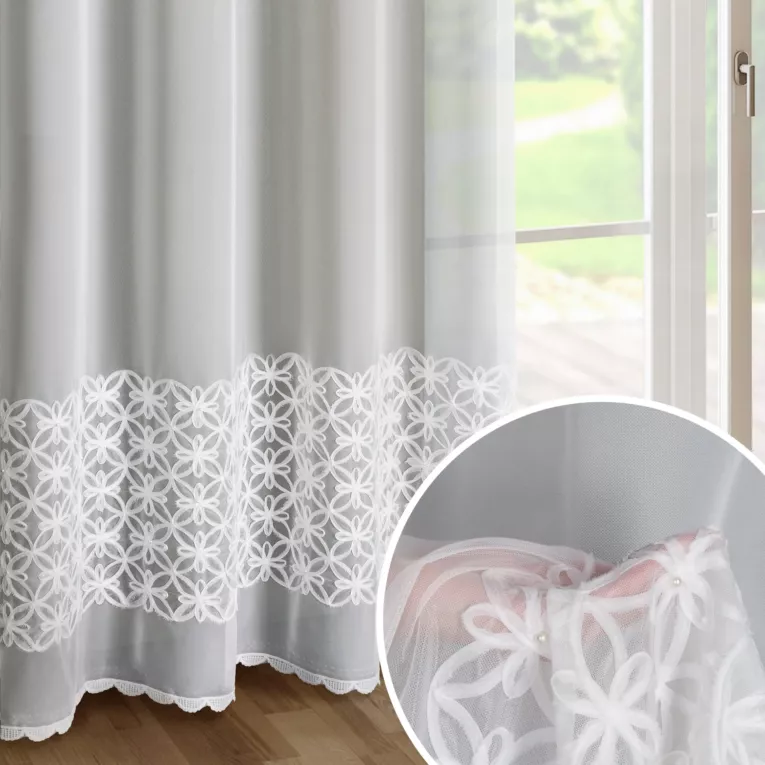 Dekoracja okienna biała z gładkiej tkaniny zdobiona pasem aplikacji w kwiaty 140x250 cm przelotka - LIWIA - EVA MINGE