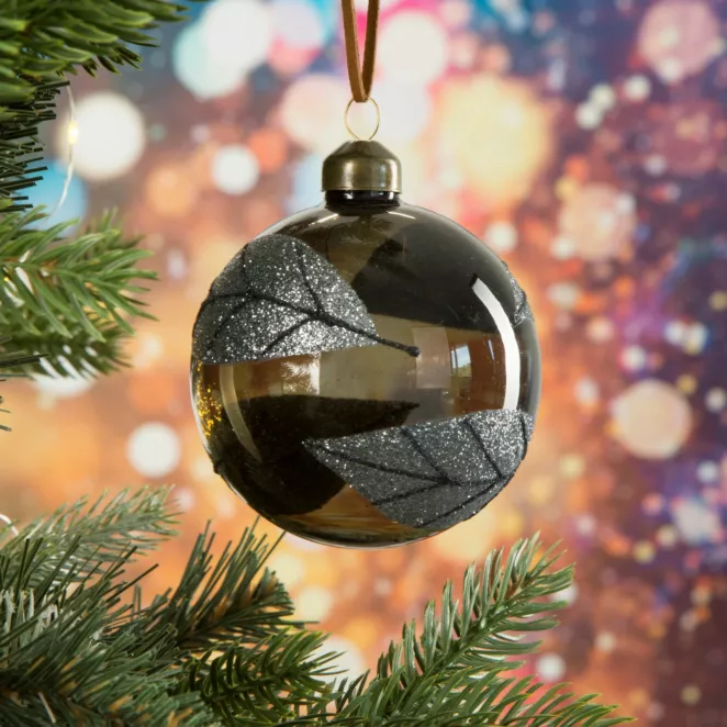 1. Świąteczna bombka szklana ręcznie zdobiona brokatowym wzorem liści ∅ 8 cm