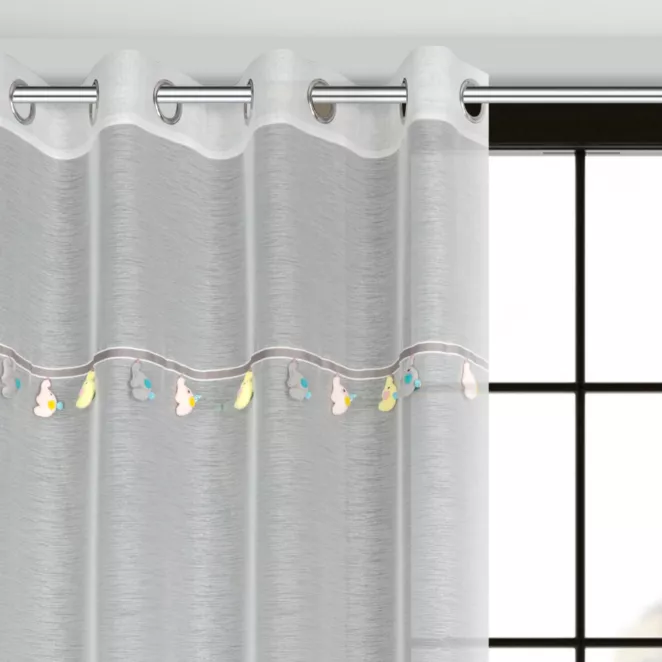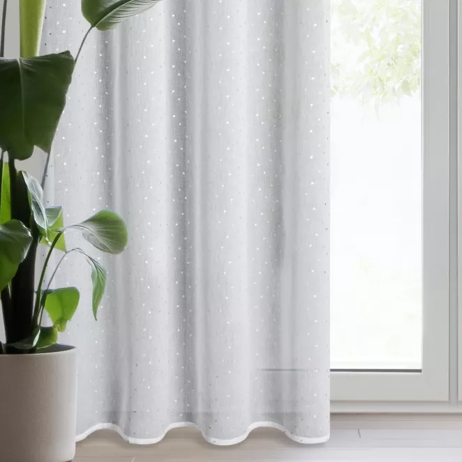 3. Firana biało, srebrzysta z błyszczącej etaminy zdobiona błyszczącym nadrukiem serduszek 140x250 cm przelotka GINA