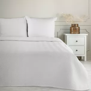 Narzuta na łóżko LEN powstała z matowego materiału  o strukturze naturalnego lnu.  Spodnia strona to delikatna mikrofibra, która zapobiega przesuwaniu się tkaniny, a miękkie wypełnienie między warstwami tkanin sprawia, że narzuta miękko i estetycznie otula łóżko. Całość połączona została za pomocą zgrzewania na gorąco (hotpress) w formie geometrycznych zygzaków. Metoda hotpress pozwala na uzyskanie dowolnych wzorów na narzutach oraz zwiększa trwałość produktu.  Taka dekoracja,  sprawdzi się również jako cienka kołdra, a nawet poza sypialnią - jako elegancka narzuta na sofę.