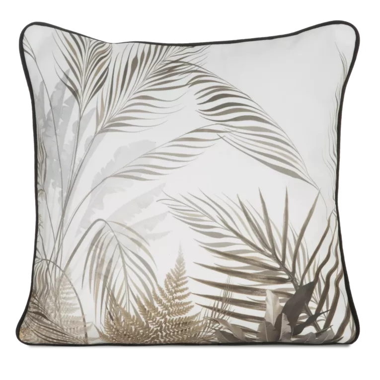 Poszewka na poduszkę 45x45 cm welwetowa biało beżowa z nadrukiem liści palmy i wypustką na brzegach EVA 17 B Eva Minge
