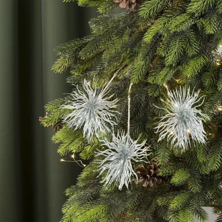 Zimowa gałązka dekoracyjna z trzema ozdobnymi kulami zdobiona połyskującym brokatem to doskonały dodatek do świątecznych kompozycji, stroików oraz wianków, jak i do zdobienia świątecznego drzewka. Duże, strzępiaste kule sprawiają wrażenie lekkich i delikatnych. W tym roku zadbaj o wyjątkową atmosferę w Twoim domu, wybierz dodatki z bogatej świątecznej oferty i ciesz się magią świąt!