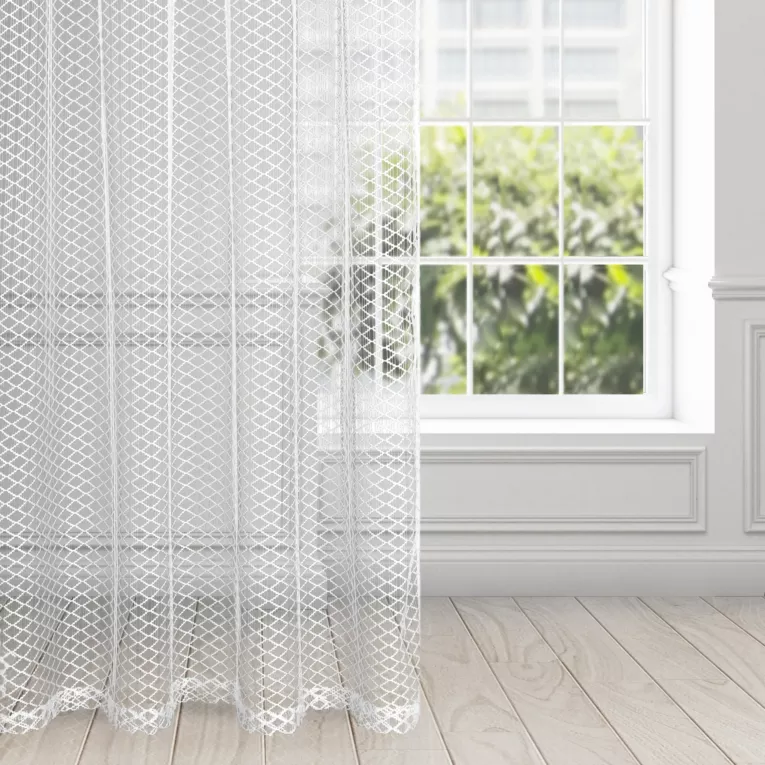 Firana AIDEN łączy w sobie prostotę geometrii z urokiem  stylu retro.  Struktura luźnej, regularnej siatki sprawia, że wnętrze jest dobrze doświetlone naturalnym światłem, a jednocześnie nabiera eleganckiego, nowoczesnego stylu. Taka dekoracja dodaje wnętrzu oryginalności i tworzy w nim niepowtarzalny klimat. Firana świetnie się sprawdza  w nowoczesnych aranżacjach, ale możesz ją z powodzeniem zastosować w stylizacjach retro, vintage czy neoromantic. Niezobowiązująca forma i brak zdobień sprawiają, że z łatwością dopasujesz do niej zasłony.  Taśma dekoracyjna wszyta w górnej części zasłony sprawia, że dekoracja pięknie się prezentuje, a tkanina umarszczona jest równomiernie, nadając jej nienaganny wygląd.