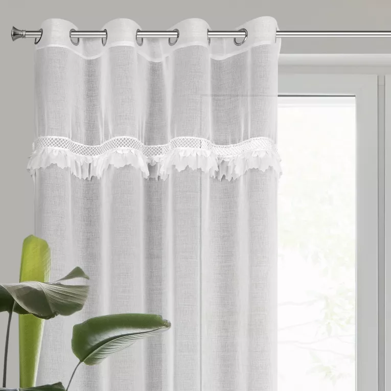 Firana biała z etaminy zdobiona aplikacją z koronki 140x250 cm przelotka KIARA