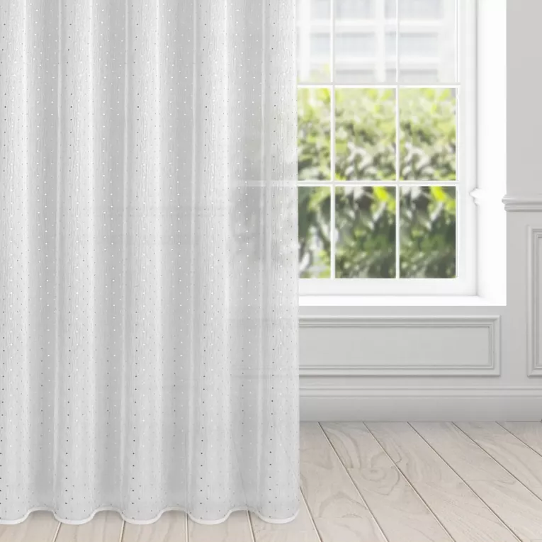 Firanę SIBEL z delikatnej białej tkaniny zdobi delikatny srebrzysty nadruk w postaci równomiernie rozmieszczonych drobnych kwadracików. Półtransparentna tkanina chroni przed nadmiarem słonecznych promieni, zapewniając jednocześnie doświetlenie wnętrza naturalnym światłem. Firana  posiada praktyczną taśmę marszczącą, dzięki czemu tkanina zjawiskowo się prezentuje po zawieszeniu na karniszu a zwiewna i lekka tkanina z praktycznego poliestru daje efekt  łagodnych fal, miękko spływających z karnisza. Nie czekaj - już dziś odmień swoje wnętrze i podkreśl jego nowoczesny charakter modną dekoracją okienną.