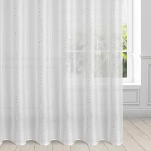 Firanę SIBEL z delikatnej białej tkaniny zdobi delikatny srebrzysty nadruk w postaci równomiernie rozmieszczonych drobnych kwadracików. Półtransparentna tkanina chroni przed nadmiarem słonecznych promieni, zapewniając jednocześnie doświetlenie wnętrza naturalnym światłem. Firana  posiada praktyczną taśmę marszczącą, dzięki czemu tkanina zjawiskowo się prezentuje po zawieszeniu na karniszu a zwiewna i lekka tkanina z praktycznego poliestru daje efekt  łagodnych fal, miękko spływających z karnisza. Nie czekaj - już dziś odmień swoje wnętrze i podkreśl jego nowoczesny charakter modną dekoracją okienną.