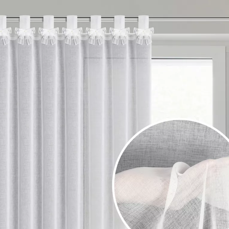 Firana biała zdobiona kokardkami 140x250 cm szelki ALEXSANDRA