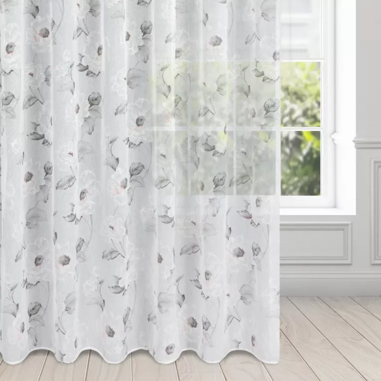Firana biało, różowa z matowej etaminy z kwiatowym motywem 350x250 cm przelotka BESSY